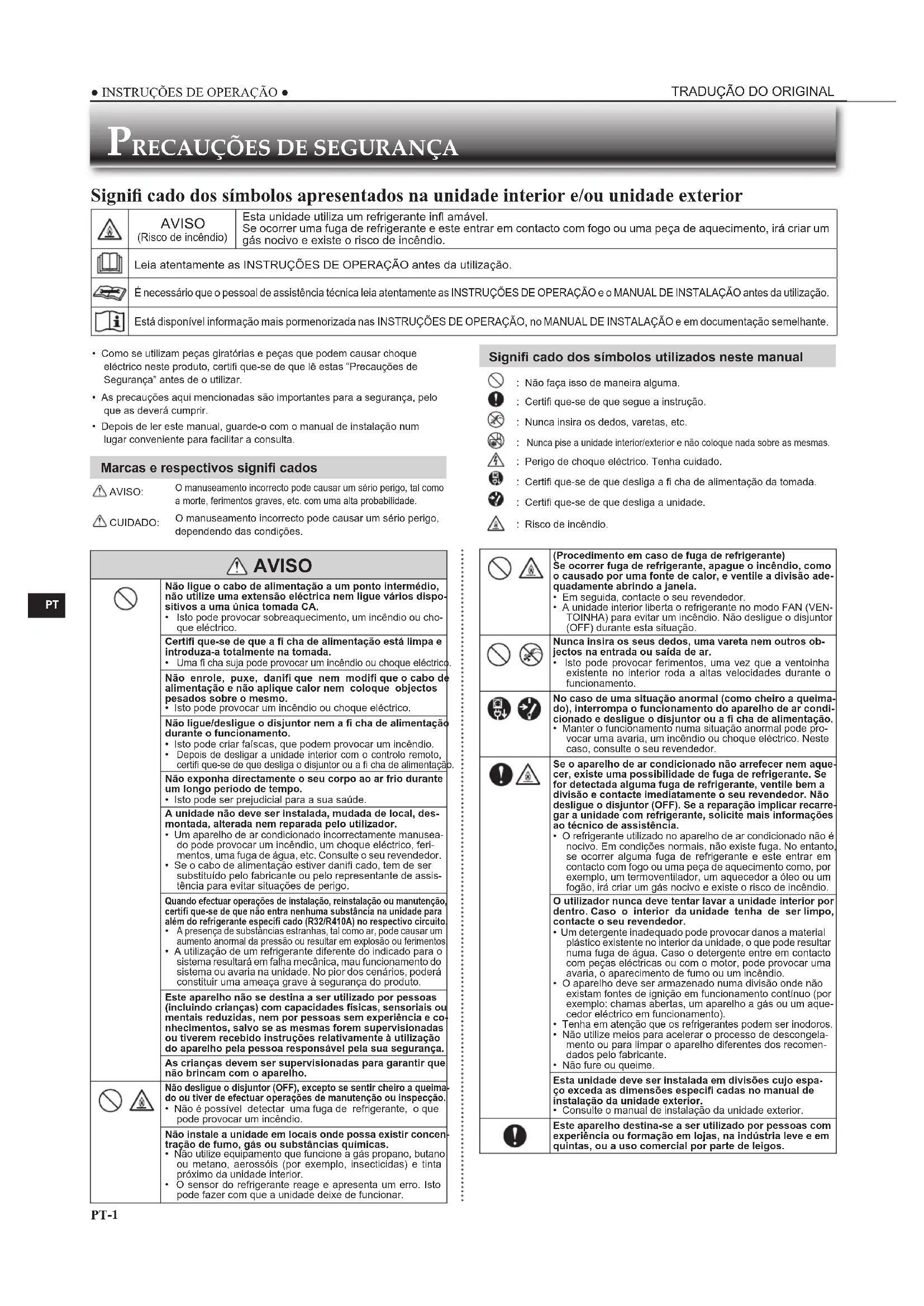 - Como se utilizam peças giratórias e peças que podem causar choque eléctrico neste produto, certifi que-se de que lê estas “Precauções de Segurança” antes de o utilizar.• As precauções aqui mencionadas são importantes para a segurança, pelo que as deverá cumprir.• Depois de ler este manual, guarde-o com o manual de instalação num lugar conveniente para facilitar a consulta. Marcas e respectivos signifi cados AVISO:O manuseamento incorrecto pode causar um sério perigo, tal como a morte, ferimentos graves, etc. com uma alta probabilidade. CUIDADO:O manuseamento incorrecto pode causar um sério perigo, dependendo das condições. Signifi cado dos símbolos utilizados neste manual : Não faça isso de maneira alguma. : Certifi que-se de que segue a instrução. : Nunca insira os dedos, varetas, etc. Nunca pise a unidade interior/exterior e não coloque nada sobre as mesmas. : Perigo de choque eléctrico. Tenha cuidado. : Certifi que-se de que desliga a fi cha de alimentação da tomada. : Certifi que-se de que desliga a unidade. : Risco de incêndio.
