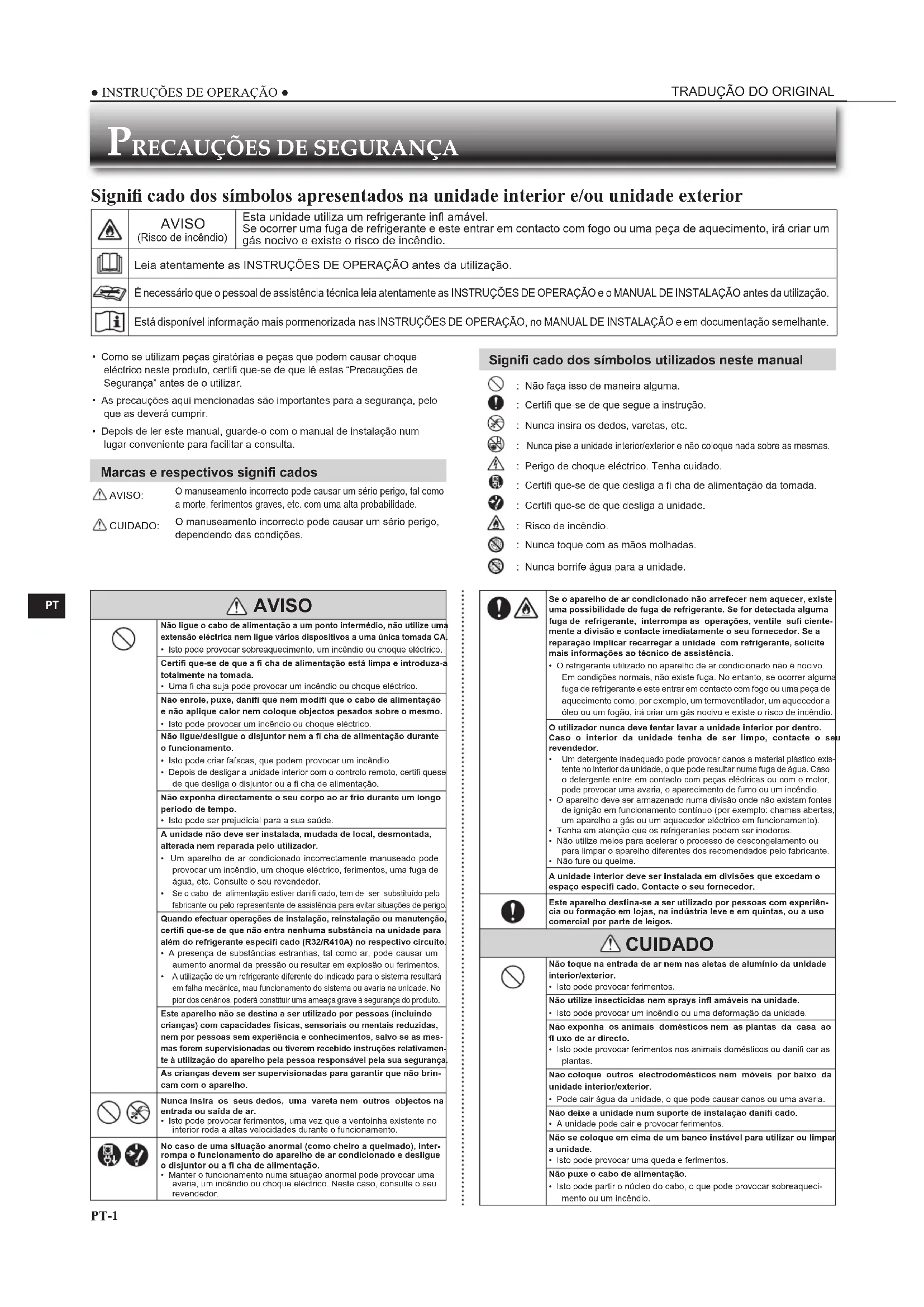 Signifi cado dos símbolos apresentados na unidade interior e/ou unidade exterior AVISO (Risco de incêndio)Esta unidade utiliza um refrigerante infl amável.Se ocorrer uma fuga de refrigerante e este entrar em contacto com fogo ou uma peça de aquecimento, irá criar um gás nocivo e existe o risco de incêndio.Leia atentamente as INSTRUÇÕES DE OPERAÇÃO antes da utilização. É necessário que o pessoal de assistência técnica leia atentamente as INSTRUÇÕES DE OPERAÇÃO e o MANUAL DE INSTALAÇÃO antes da utilização. Está disponível informação mais pormenorizada nas INSTRUÇÕES DE OPERAÇÃO, no MANUAL DE INSTALAÇÃO e em documentação semelhante. AVISO Não ligue o cabo de alimentação a um ponto intermédio, não utilize uma extensão eléctrica nem ligue vários dispositivos a uma única tomada CA.• Isto pode provocar sobreaquecimento, um incêndio ou choque eléctrico.Certifi que-se de que a fi cha de alimentação está limpa e introduza-a totalmente na tomada.• Uma fi cha suja pode provocar um incêndio ou choque eléctrico.Não enrole, puxe, danifi que nem modifi que o cabo de alimentação e não aplique calor nem coloque objectos pesados sobre o mesmo.• Isto pode provocar um incêndio ou choque eléctrico.Não ligue/desligue o disjuntor nem a fi cha de alimentação durante o funcionamento.• Isto pode criar faíscas, que podem provocar um incêndio.• Depois de desligar a unidade interior com o controlo remoto, certifi quese de que desliga o disjuntor ou a fi cha de alimentação. Não exponha directamente o seu corpo ao ar frio durante um longo período de tempo.• Isto pode ser prejudicial para a sua saúde.A unidade não deve ser instalada, mudada de local, desmontada, alterada nem reparada pelo utilizador.• Um aparelho de ar condicionado incorrectamente manuseado pode provocar um incêndio, um choque eléctrico, ferimentos, uma fuga de água, etc. Consulte o seu revendedor. Se o cabo de alimentação estiver danifi cado, tem de ser substituído pelo fabricante ou pelo representante de assistência para evitar situações de perigo.Quando efectuar operações de instalação, reinstalação ou manutenção, certifi que-se de que não entra nenhuma substância na unidade para além do refrigerante especifi cado (R32/R410A) no respectivo circuito.• A presença de substâncias estranhas, tal como ar, pode causar um aumento anormal da pressão ou resultar em explosão ou ferimentos. A utilização de um refrigerante diferente do indicado para o sistema resultará em falha mecânica, mau funcionamento do sistema ou avaria na unidade. No pior dos cenários, poderá constituir uma ameaça grave à segurança do produto.Este aparelho não se destina a ser utilizado por pessoas (incluindo crianças) com capacidades físicas, sensoriais ou mentais reduzidas, nem por pessoas sem experiência e conhecimentos, salvo se as mes-mas forem supervisionadas ou tiverem recebido instruções relativamen-te à utilização do aparelho pela pessoa responsável pela sua segurança.As crianças devem ser supervisionadas para garantir que não brin-cam com o aparelho. Nunca insira os seus dedos, uma vareta nem outros objectos na entrada ou saída de ar.• Isto pode provocar ferimentos, uma vez que a ventoinha existente no interior roda a altas velocidades durante o funcionamento. No caso de uma situação anormal (como cheiro a queimado), inter-rompa o funcionamento do aparelho de ar condicionado e desligue o disjuntor ou a fi cha de alimentação.• Manter o funcionamento numa situação anormal pode provocar uma avaria, um incêndio ou choque eléctrico. Neste caso, consulte o seu revendedor. Se o aparelho de ar condicionado não arrefecer nem aquecer, existe uma possibilidade de fuga de refrigerante. Se for detectada alguma fuga de refrigerante, interrompa as operações, ventile sufi ciente-mente a divisão e contacte imediatamente o seu fornecedor. Se a reparação implicar recarregar a unidade com refrigerante, solicite mais informações ao técnico de assistência.• O refrigerante utilizado no aparelho de ar condicionado não é nocivo. Em condições normais, não existe fuga. No entanto, se ocorrer alguma fuga de refrigerante e este entrar em contacto com fogo ou uma peça de aquecimento como, por exemplo, um termoventilador, um aquecedor a óleo ou um fogão, irá criar um gás nocivo e existe o risco de incêndio.O utilizador nunca deve tentar lavar a unidade interior por dentro. Caso o interior da unidade tenha de ser limpo, contacte o seu revendedor. Um detergente inadequado pode provocar danos a material plástico exis-tente no interior da unidade, o que pode resultar numa fuga de água. Caso o detergente entre em contacto com peças eléctricas ou com o motor, pode provocar uma avaria, o aparecimento de fumo ou um incêndio.• O aparelho deve ser armazenado numa divisão onde não existam fontes de ignição em funcionamento contínuo (por exemplo: chamas abertas, um aparelho a gás ou um aquecedor eléctrico em funcionamento).• Tenha em atenção que os refrigerantes podem ser inodoros.• Não utilize meios para acelerar o processo de descongelamento ou para limpar o aparelho diferentes dos recomendados pelo fabricante.• Não fure ou queime.A unidade interior deve ser instalada em divisões que excedam o espaço especifi cado. Contacte o seu fornecedor.Este aparelho destina-se a ser utilizado por pessoas com experiên-cia ou formação em lojas, na indústria leve e em quintas, ou a uso comercial por parte de leigos. CUIDADO Não toque na entrada de ar nem nas aletas de alumínio da unidade interior/exterior.• Isto pode provocar ferimentos.Não utilize insecticidas nem sprays infl amáveis na unidade.• Isto pode provocar um incêndio ou uma deformação da unidade.Não exponha os animais domésticos nem as plantas da casa ao fl uxo de ar directo.• Isto pode provocar ferimentos nos animais domésticos ou danifi car as plantas.Não coloq