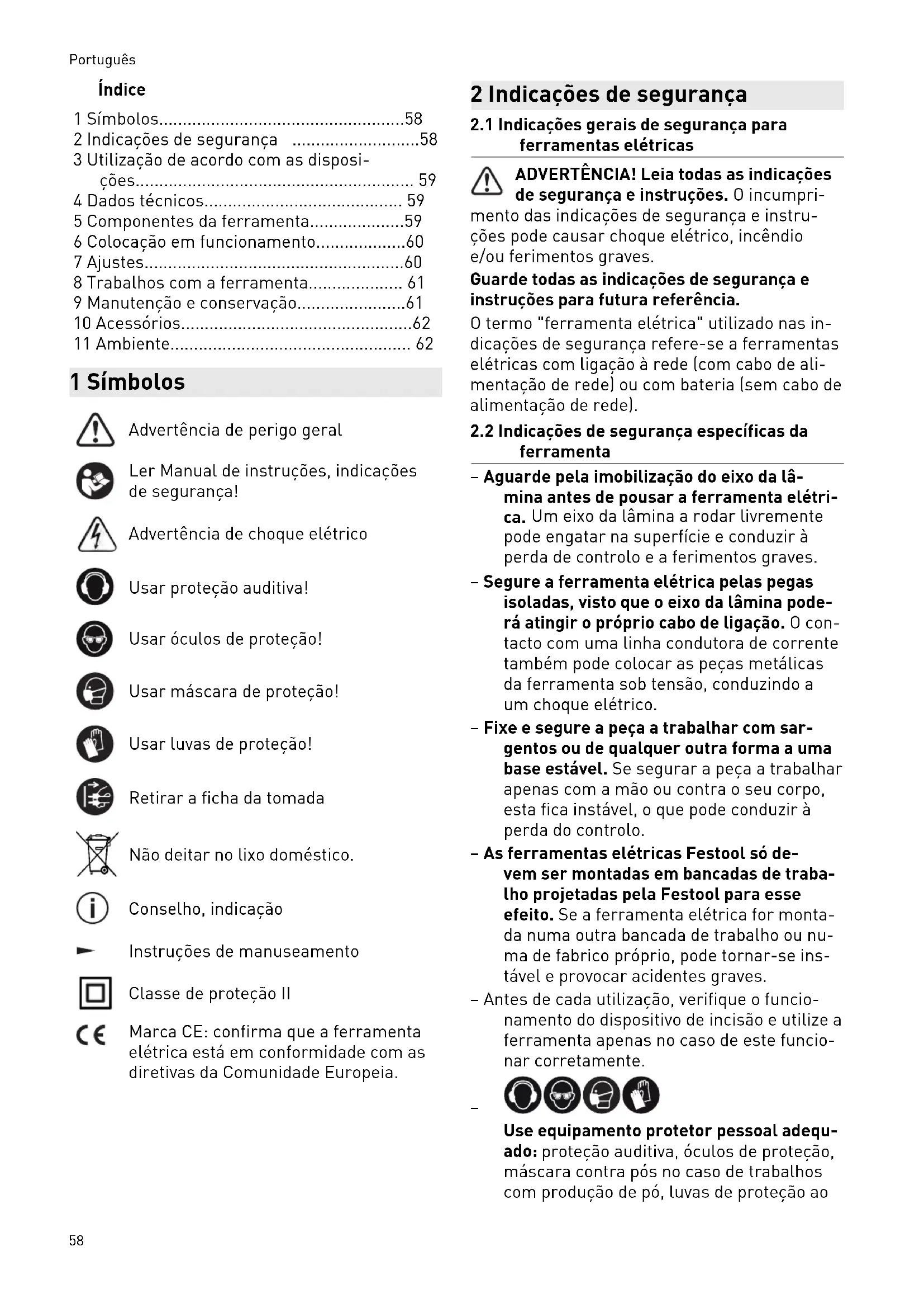 - 11 Ambiente 1 Símbolos Advertência de perigo geral Ler Manual de instruções, indicações de segurança! Advertência de choque elétrico Usar proteção auditiva! Usar óculos de proteção! Usar máscara de proteção! Usar luvas de proteção! Retirar a ficha da tomada Não deitar no lixo doméstico. Conselho, indicação Instruções de manuseamento Classe de proteção II Marca CE: confirma que a ferramenta elétrica está em conformidade com as diretivas da Comunidade Europeia. 2 Indicações de segurança p. 62