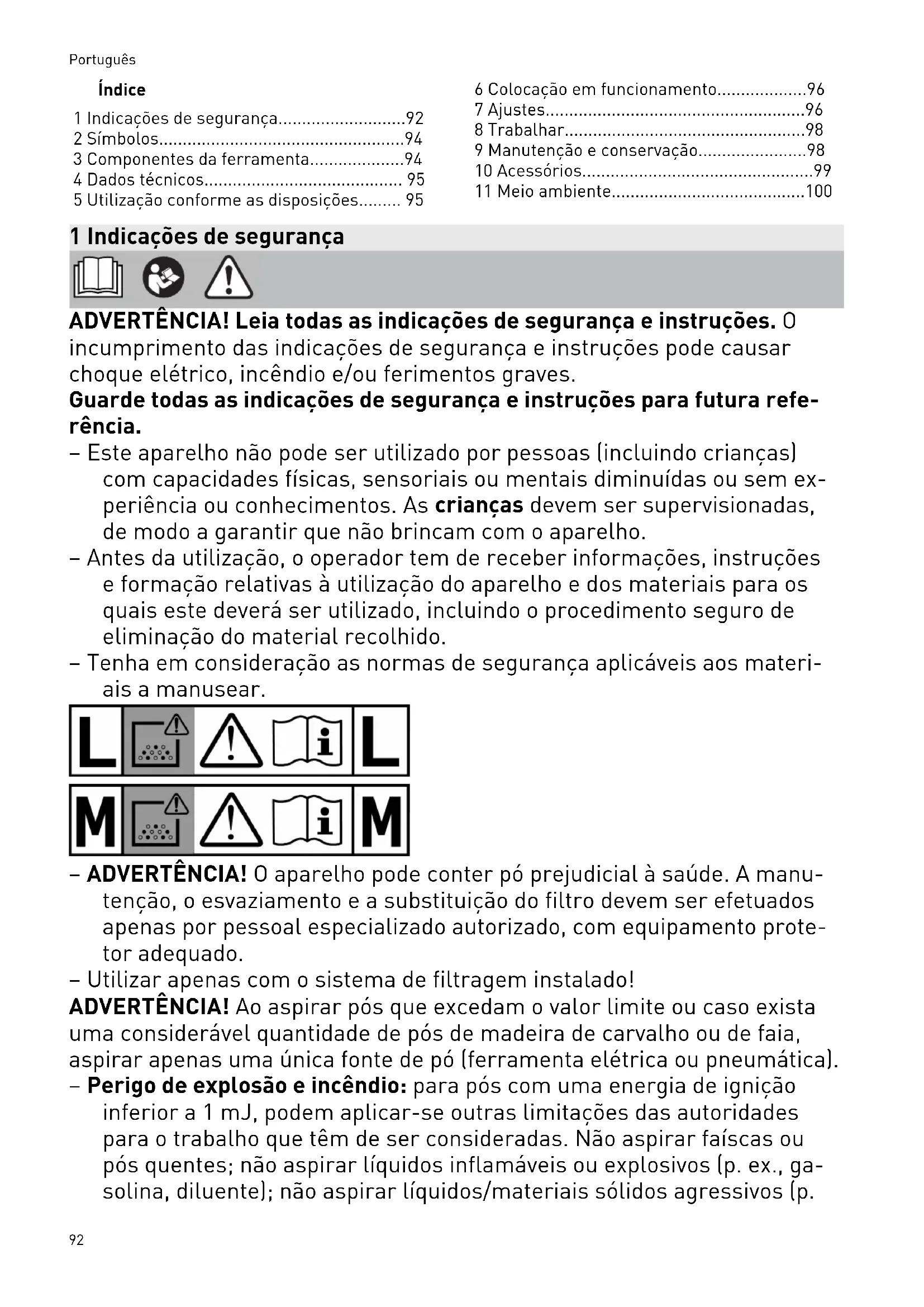 - 11 Meio ambiente 1 Indicações de segurança ADVERTÊNCIA! Leia todas as indicações de segurança e instruções. O incumprimento das indicações de segurança e instruções pode causar choque elétrico, incêndio e/ou ferimentos graves. Guarde todas as indicações de segurança e instruções para futura refe rência. – Este aparelho não pode ser utilizado por pessoas (incluindo crianças) com capacidades físicas, sensoriais ou mentais diminuídas ou sem ex periência ou conhecimentos. As crianças devem ser supervisionadas, de modo a garantir que não brincam com o aparelho. – Antes da utilização, o operador tem de receber informações, instruções e formação relativas à utilização do aparelho e dos materiais para os quais este deverá ser utilizado, incluindo o procedimento seguro de eliminação do material recolhido. – Tenha em consideração as normas de segurança aplicáveis aos materi ais a manusear. – ADVERTÊNCIA! O aparelho pode conter pó prejudicial à saúde. A manu tenção, o esvaziamento e a substituição do filtro devem ser efetuados apenas por pessoal especializado autorizado, com equipamento prote tor adequado. – Utilizar apenas com o sistema de filtragem instalado! ADVERTÊNCIA! Ao aspirar pós que excedam o valor limite ou caso exista uma considerável quantidade de pós de madeira de carvalho ou de faia, aspirar apenas uma única fonte de pó (ferramenta elétrica ou pneumática). – Perigo de explosão e incêndio: para pós com uma energia de ignição inferior a 1mJ, podem aplicar-se outras limitações das autoridades para o trabalho que têm de ser consideradas. Não aspirar faíscas ou pós quentes; não aspirar líquidos inflamáveis ou explosivos (p. ex., ga solina, diluente); não aspirar líquidos/materiais sólidos agressivos (p. Português 92ex., ácidos, lixívias, solventes). Este aspirador móvel é adequado para a aspiração de pós de pintura. – Não danificar o cabo de ligação à rede (p. ex., passando por cima dele, puxando, etc.). Proteger contra calor, óleo e arestas cortantes. Não puxar pelo cabo para retirar a ficha da tomada. – Verificar regularmente a ficha e o cabo e, em caso de danos, mandá-los substituir numa oficina de Serviço Após-venda autorizada. Substituir o cabo de ligação à rede apenas pelo modelo indicado na lista de peças sobresselentes. – Não expor o aparelho à chuva. – Por razões de segurança, ligar o aparelho apenas a uma tomada com proteção de terra. – Utilizar a tomada no aparelho apenas para a finalidade indicada no manual de instruções. – Utilizar apenas acessórios originais Festool. – Em caso de não utilização e antes de trabalhos de manutenção e limpe za, retirar a ficha da tomada de corrente. p. 100