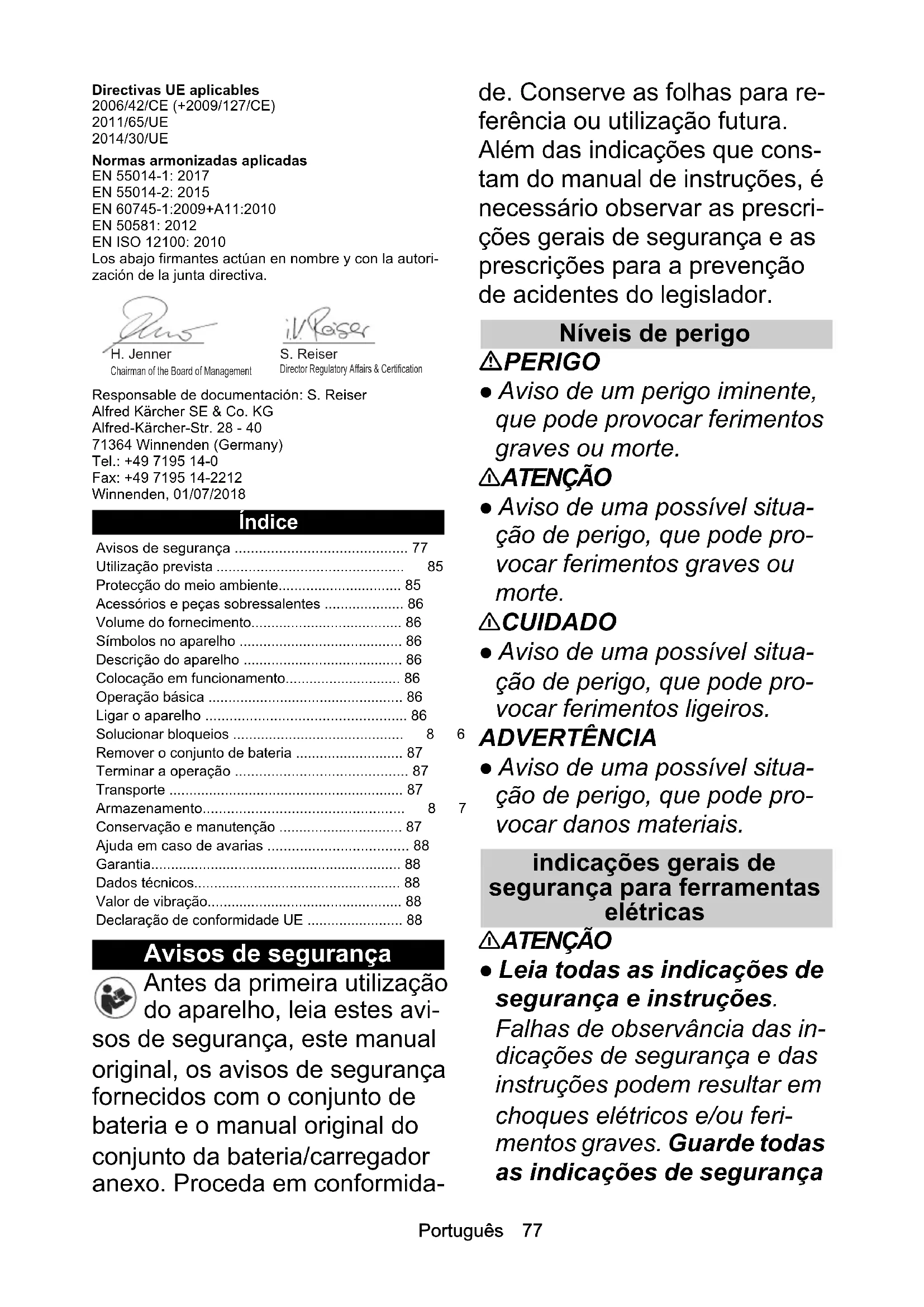 - 1,5 Peso y dimensiones Longitud x anchura x altura mm 911 x 96 x 212 Peso (sin batería) kg 2,4Português 77 Directivas UE aplicables 2006/42/CE (+2009/127/CE) 2011/65/UE 2014/30/UE Normas armonizadas aplicadas EN 55014-1: 2017 EN 55014-2: 2015 EN 60745-1:2009+A11:2010 EN 50581: 2012 EN ISO 12100: 2010 Los abajo firmantes actúan en nombre y con la autori- zación de la junta directiva. Responsable de documentación: S. Reiser Alfred Kärcher SE & Co. KG Alfred-Kärcher-Str. 28 - 40 71364 Winnenden (Germany) Tel.: +49 7195 14-0 Fax: +49 7195 14-2212 Winnenden, 01/07/2018 Índice Avisos de segurança Antes da primeira utilização do aparelho, leia estes avi- sos de segurança, este manual original, os avisos de segurança fornecidos com o conjunto de bateria e o manual original do conjunto da bateria/carregador anexo. Proceda em conformida- de. Conserve as folhas para re- ferência ou utilização futura. Além das indicações que cons- tam do manual de instruções, é necessário observar as prescri- ções gerais de segurança e as prescrições para a prevenção de acidentes do legislador. Níveis de perigo PERIGO ● Aviso de um perigo iminente, que pode provocar ferimentos graves ou morte. 몇 ATENÇÃO ● Aviso de uma possível situa- ção de perigo, que pode pro- vocar ferimentos graves ou morte. 몇 CUIDADO ● Aviso de uma possível situa- ção de perigo, que pode pro- vocar ferimentos ligeiros. ADVERTÊNCIA ● Aviso de uma possível situa- ção de perigo, que pode pro- vocar danos materiais. indicações gerais de segurança para ferramentas elétricas 몇 ATENÇÃO ● Leia todas as indicações de segurança e instruções. Falhas de observância das in- dicações de segurança e das instruções podem resultar em choques elétricos e/ou feri- mentos graves. Guarde todas as indicações de segurança Avisos de segurança p. 77