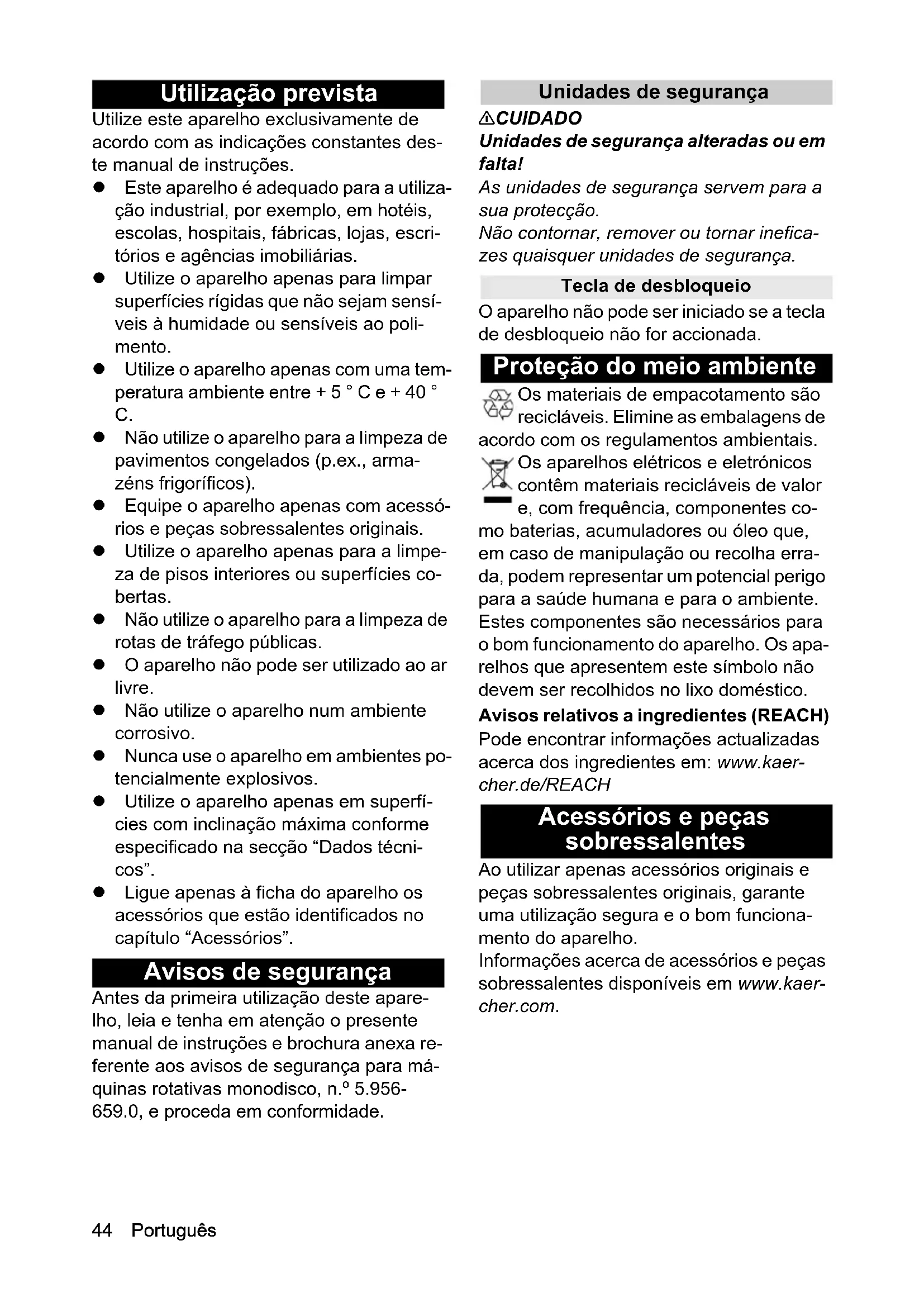 Não utilize o aparelho para a limpeza de pavimentos congelados (p.ex., arma- zéns frigoríficos). Equipe o aparelho apenas com acessó- rios e peças sobressalentes originais. Utilize o aparelho apenas para a limpe- za de pisos interiores ou superfícies co- bertas. Não utilize o aparelho para a limpeza de rotas de tráfego públicas. O aparelho não pode ser utilizado ao ar livre. Não utilize o aparelho num ambiente corrosivo. Nunca use o aparelho em ambientes po- tencialmente explosivos. Utilize o aparelho apenas em superfí- cies com inclinação máxima conforme especificado na secção “Dados técni- cos”. Ligue apenas à ficha do aparelho os acessórios que estão identificados no capítulo “Acessórios”. Avisos de segurança Antes da primeira utilização deste apare- lho, leia e tenha em atenção o presente manual de instruções e brochura anexa re- ferente aos avisos de segurança para má- quinas rotativas monodisco, n.º 5.956- 659.0, e proceda em conformidade. Unidades de segurança 몇 CUIDADO Unidades de segurança alteradas ou em falta! As unidades de segurança servem para a sua protecção. Não contornar, remover ou tornar inefica- zes quaisquer unidades de segurança. Tecla de desbloqueio O aparelho não pode ser iniciado se a tecla de desbloqueio não for accionada. Proteção do meio ambiente Os materiais de empacotamento são recicláveis. Elimine as embalagens de acordo com os regulamentos ambientais. Os aparelhos elétricos e eletrónicos contêm materiais recicláveis de valor e, com frequência, componentes co- mo baterias, acumuladores ou óleo que, em caso de manipulação ou recolha erra- da, podem representar um potencial perigo para a saúde humana e para o ambiente. Estes componentes são necessários para o bom funcionamento do aparelho. Os apa- relhos que apresentem este símbolo não devem ser recolhidos no lixo doméstico. Avisos relativos a ingredientes (REACH) Pode encontrar informações actualizadas acerca dos ingredientes em: www.kaer- cher.de/REACH Acessórios e peças sobressalentes Ao utilizar apenas acessórios originais e peças sobressalentes originais, garante uma utilização segura e o bom funciona- mento do aparelho. Informações acerca de acessórios e peças sobressalentes disponíveis em www.kaer- cher.com.Português 45 Acessórios Volume do fornecimento Ao abrir a embalagem, confirme a integra- lidade do conteúdo. Caso faltem acessó- rios ou em caso de danos de transporte informe o seu fornecedor. Elementos de comando Figura A 1 BDP 43/400 C 2 BDP 43/400 C com kit de montagem (ABS) do depósito 3 BDP 43/400 C com kit de montagem (ABS) do pulverizador 4 BDP 43/400 C com kit de montagem (ABS) da aspiração 5 Cabeça de limpeza 6 Placa de características 7 Cabo de rede com ficha de rede 8 Braçadeira para cabo rotativa 9 Aliviador de tensão 10 Haste de empurrar 11 Haste de tração* 12 Depósito* 13 Mangueira da solução de limpeza* 14 Haste da bomba** 15 Alavanca de pulverização** 16 Pulverizador** 17 Escova ou porta-pads / disco 18 Bico pulverizador** 19 Luz de controlo da tensão da rede 20 Punho 21 Interruptor LIG./DESL. aspiração*** 22 Luz de advertência de aspiração*** 23 Ficha de rede da aspiração*** 24 Alavanca da solução de limpeza 25 Alavanca ON/OFF 26 Tecla de desbloqueio 27 Alavanca de ajuste da inclinação 28 Avental de aspiração*** 29 Mangueira de aspiração*** 30 Filtro do ar de exaustão*** 31 Saco de pó*** 32 Unidade de aspiração*** 33 Corrediça de regulação da corrente de aspiração***