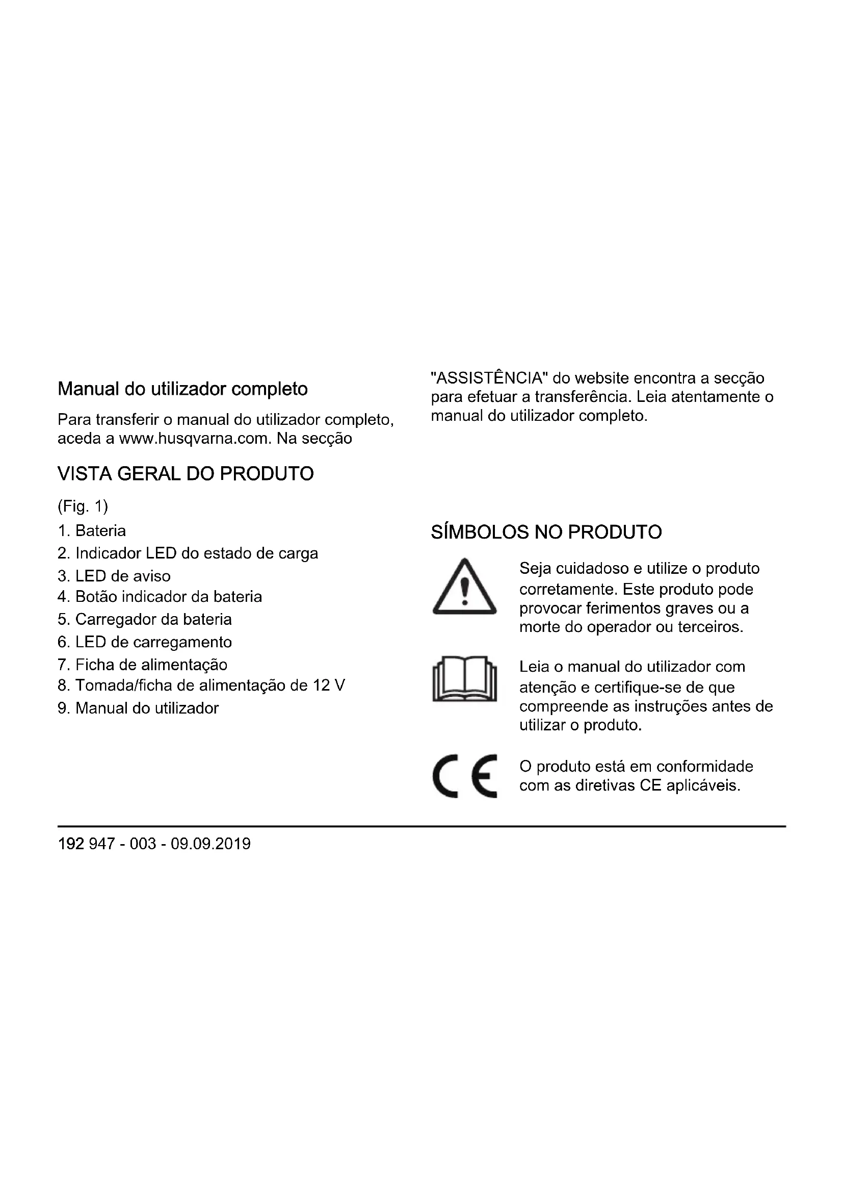 Seja cuidadoso e utilize o produto corretamente. Este produto pode provocar ferimentos graves ou a morte do operador ou terceiros. Leia o manual do utilizador com atenção e certifique-se de que compreende as instruções antes de utilizar o produto. O produto está em conformidade com as diretivas CE aplicáveis. 192 947 - 003 - 09.09.2019O produto ou a respetiva embalagem não são resíduos domésticos. Recicle-os numa localização de eliminação aplicável para equipamentos elétricos e eletrónicos. Mantenha a unidade afastada de água e da chuva. Utilize e armazene o carregador da bateria apenas em espaços interiores. Nota: Os restantes símbolos/autocolantes existentes no produto dizem respeito a requisitos para homologação em algumas áreas comerciais.