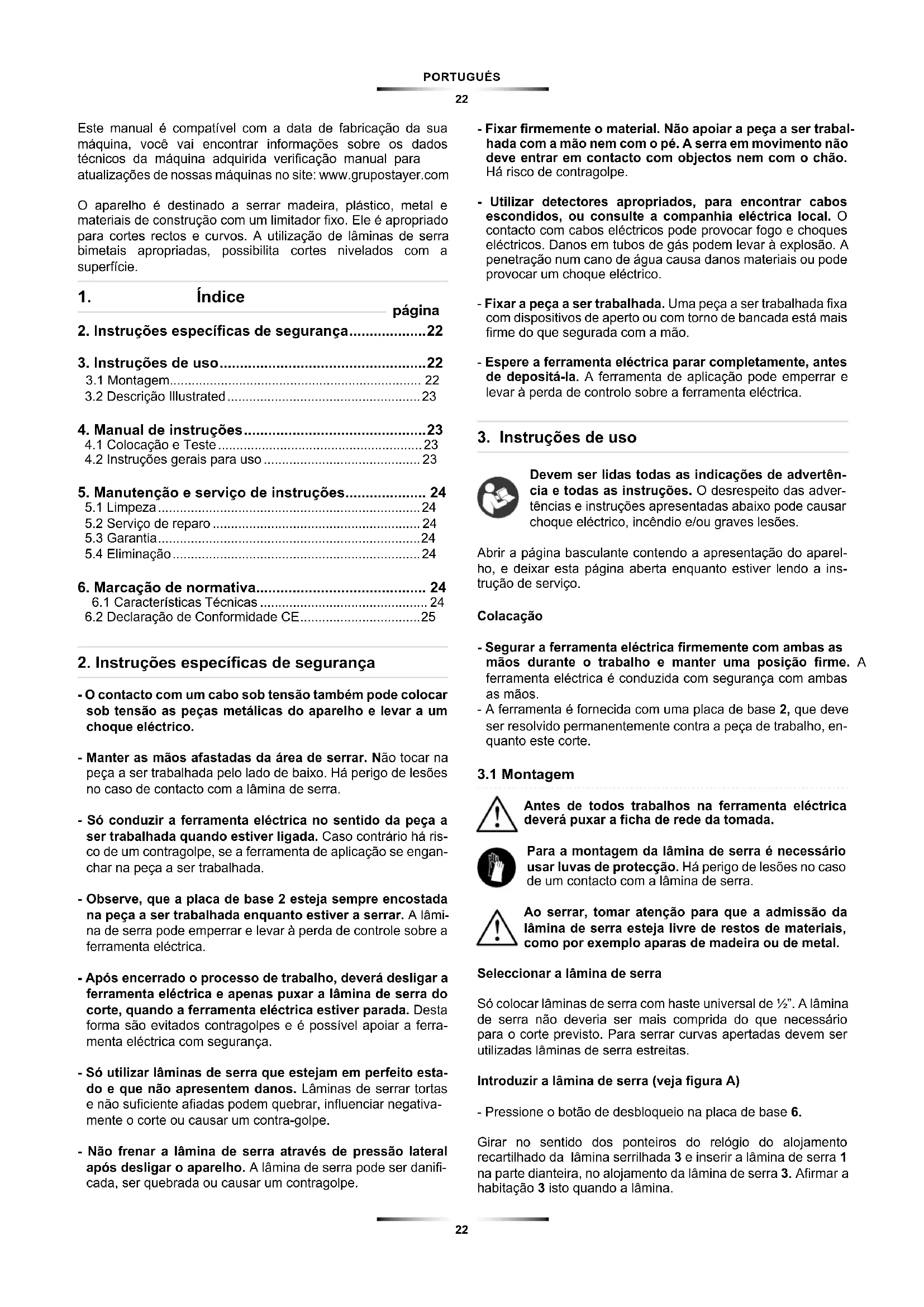 Este manual é compatível com a data de fabricação da sua máquina, você vai encontrar informações sobre os dados técnicos da máquina adquirida vericação manual para atualizações de nossas máquinas no site: www.grupostayer.com O aparelho é destinado a serrar madeira, plástico, metal e materiais de construção com um limitador xo. Ele é apropriado para cortes rectos e curvos. A utilização de lâminas de serra bimetais apropriadas, possibilita cortes nivelados com a superfície.
