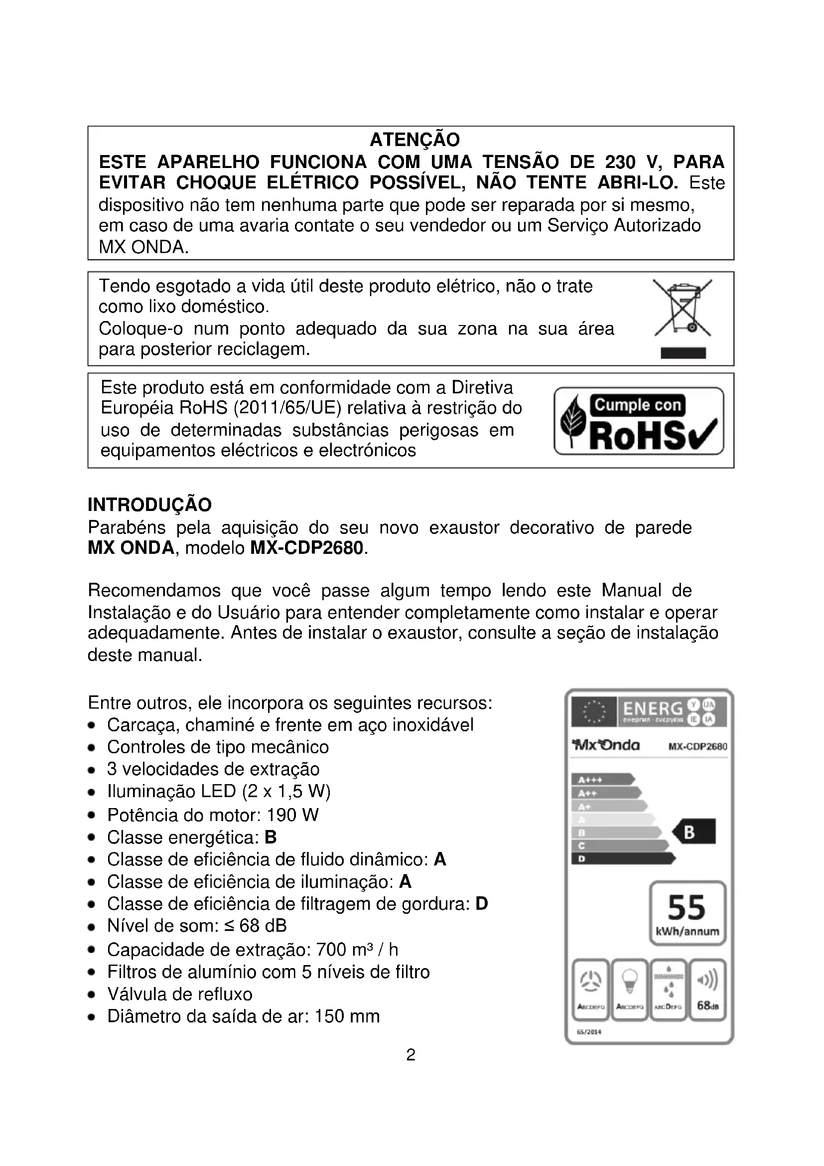 INTRODUÇÃO Parabéns pela aquisição do seu novo exaustor decorativo de parede MX ONDA, modelo MX-CDP2680. Recomendamos que você passe algum tempo lendo este Manual de Instalação e do Usuário para entender completamente como instalar e operar adequadamente. Antes de instalar o exaustor, consulte a seção de instalação deste manual. Entre outros, ele incorpora os seguintes recursos: Carcaça, chaminé e frente em aço inoxidável Controles de tipo mecânico 3 velocidades de extração Iluminação LED (2 x 1,5 W) Potência do motor: 190 W Classe energética: B Classe de eficiência de fluido dinâmico: A Classe de eficiência de iluminação: A Classe de eficiência de filtragem de gordura: D Nível de som: ≤ 68 dB Capacidade de extração: 700 m³ / h Filtros de alumínio com 5 níveis de filtro Válvula de refluxo Diâmetro da saída de ar: 150 mm3