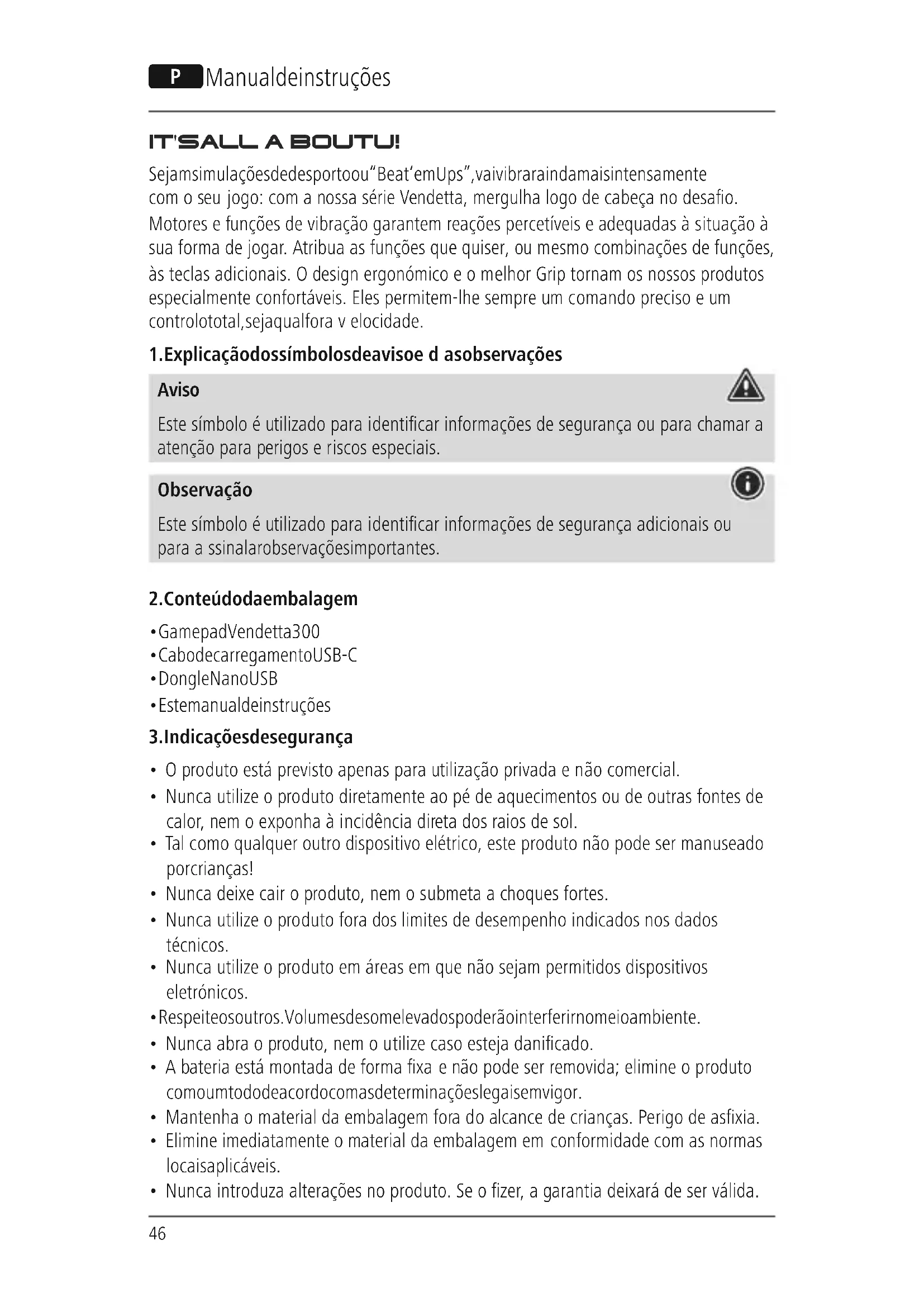 Hama GmbH &CoKGtýmto vyhlasuje, že rádiové zariadenie typu [00186075] je vsúlade so smernicou 2014/53/EÚ. Úplný text vyhlásenia o zhode EÚ je kdispozícii na nasledujúcej internetovej adrese: www.hama. com->00186075->Downloads. Frekvenčné pásmo /frekvenčné pásma 2400 –2483 MHz Vyžarovaný maximálny prenosový výkon 0dBm46 O Manual de instruções IT'S ALLABOUT U! Sejam simulações de desporto ou “Beat ‘em Ups”, vai vibrar ainda mais intensamente com oseu jogo: com anossa série Vendetta, mergulha logo de cabeça no desao. Motores efunções de vibração garantem reações percetíveis eadequadas àsituação à sua forma de jogar.Atribua as funções que quiser,oumesmo combinações de funções, às teclas adicionais. Odesign ergonómico eomelhor Grip tornam os nossos produtos especialmente confortáveis. Eles permitem-lhe sempreumcomando preciso eum controlo total, seja qual for avelocidade.