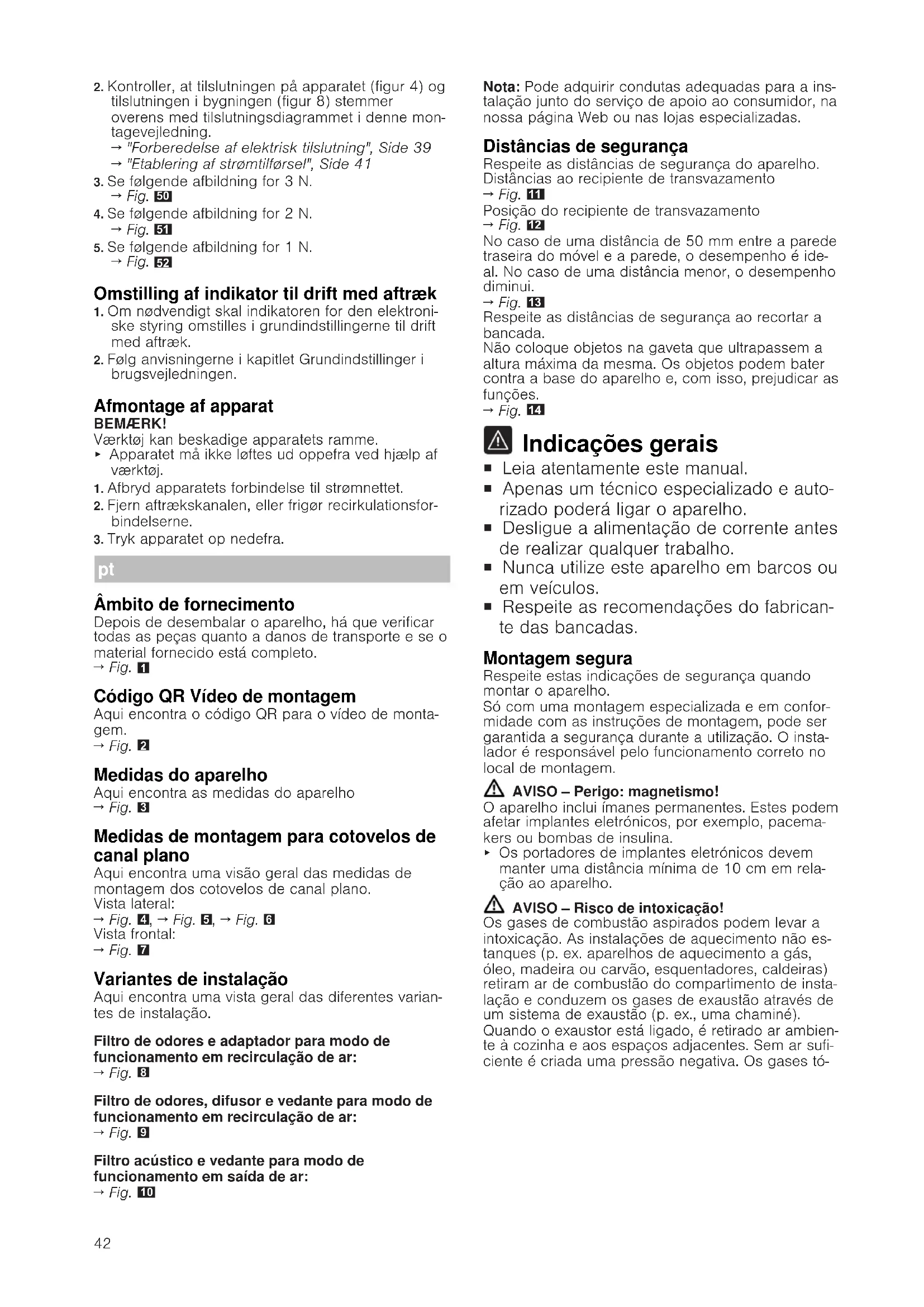Indicações gerais ¡ Leia atentamente este manual. ¡ Apenas um técnico especializado e auto- rizado poderá ligar o aparelho. ¡ Desligue a alimentação de corrente antes de realizar qualquer trabalho. ¡ Nunca utilize este aparelho em barcos ou em veículos. ¡ Respeite as recomendações do fabrican- te das bancadas. Montagem segura Respeite estas indicações de segurança quando montar o aparelho. Só com uma montagem especializada e em confor- midade com as instruções de montagem, pode ser garantida a segurança durante a utilização. O insta- lador é responsável pelo funcionamento correto no local de montagem. AVISO‒Perigo: magnetismo! O aparelho inclui ímanes permanentes. Estes podem afetar implantes eletrónicos, por exemplo, pacema- kers ou bombas de insulina. ▶ Os portadores de implantes eletrónicos devem manter uma distância mínima de 10cm em rela- ção ao aparelho. AVISO‒Risco de intoxicação! Os gases de combustão aspirados podem levar a intoxicação. As instalações de aquecimento não es- tanques (p. ex. aparelhos de aquecimento a gás, óleo, madeira ou carvão, esquentadores, caldeiras) retiram ar de combustão do compartimento de insta- lação e conduzem os gases de exaustão através de um sistema de exaustão (p. ex., uma chaminé). Quando o exaustor está ligado, é retirado ar ambien- te à cozinha e aos espaços adjacentes. Sem ar sufi- ciente é criada uma pressão negativa. Os gases tó-43 xicos da chaminé ou da conduta de extração voltam a ser aspirados para os espaços habitacionais. ▶ Certifique-se de que há sempre reposição de ar fresco suficiente quando o aparelho é utilizado no modo de funcionamento em saída de ar em con- junto com instalações de aquecimento não estan- ques. ▶ Um funcionamento isento de perigos apenas é possível, se a pressão negativa no compartimento da instalação de aquecimento não ultrapassar os 4 Pa (0,04 mbar). Isto pode ser conseguido se o ar necessário para a combustão puder ser repos- to através de aberturas que não fechem, p. ex., em portas, janelas, em conjunto com uma caixa de entrada/saída de ar ou outras medidas técni- cas, que permitam uma circulação de ar suficien- te para a combustão. Uma caixa de entrada/saída de ar por si só, não garante a manutenção do va- lor-limite. ▶ Consulte sempre a entidade responsável para avaliar a interligação da ventilação de toda a casa e sugerir as medidas adequadas de ventilação. ▶ Se o aparelho funcionar exclusivamente em recir- culação de ar, não existe qualquer limitação na sua utilização. AVISO‒Risco de incêndio! Gorduras acumuladas no filtro de gorduras podem incendiar-se. ▶ Nunca trabalhe com uma chama aberta perto do aparelho (p.ex., flambear). ▶ Só deve instalar o aparelho perto de um fogão para combustíveis sólidos (p. ex., madeira ou car- vão) se existir uma cobertura fechada e não amo- vível. Não pode haver produção de faíscas. AVISO‒Risco de ferimentos! Quaisquer modificações na instalação elétrica ou mecânica são perigosas e podem provocar falhas de funcionamento. ▶ Não efetue modificações na instalação elétrica ou mecânica. As peças que ficam acessíveis durante a montagem podem ter arestas afiadas e originar ferimentos de corte. ▶ Use luvas de proteção O aparelho é pesado. ▶ São necessárias 2 pessoas para transportar o aparelho. ▶ Utilize apenas meios auxiliares apropriados. AVISO‒Risco de asfixia! As crianças podem colocar o material de embala- gem sobre a cabeça ou enrolar-se no mesmo e su- focar. ▶ Manter o material de embalagem fora do alcance das crianças. ▶ Não permitir que as crianças brinquem com o ma- terial de embalagem. AVISO‒Risco de intoxicação! Os gases de combustão aspirados podem levar a intoxicação. ▶ Não encaminhe o ar evacuado para uma chaminé de exaustão de fumos ou de gases queimados que esteja em funcionamento. ▶ Não encaminhe o ar evacuado para uma caixa de ar que sirva para a ventilação de locais com larei- ras instaladas. ▶ Caso o ar evacuado tenha de ser encaminhado para uma chaminé de exaustão de fumos ou de gases queimados que não esteja em funciona- mento, é necessária uma autorização da entidade supervisora da instalação dos aparelhos de quei- ma. Os gases de combustão aspirados podem levar a intoxicação. ▶ Se for instalado um exaustor com instalação de aquecimento não estanque, é necessário munir a alimentação de corrente do exaustor com um cir- cuito de segurança adequado. Indicações relativas à ligação elétrica Para poder efetuar a ligação elétrica do aparelho em segurança, respeite estas indicações. AVISO‒Risco de choque elétrico! Deve existir a possibilidade de desligar o aparelho da rede elétrica em qualquer altura. O aparelho só pode ser ligado a uma tomada de ligação instalada em conformidade com as normas. ▶ Na instalação elétrica fixa é necessário montar um dispositivo de seccionamento omnipolar em con- formidade com as condições da categoria de so- bretensão III e com as regras de instalação. ▶ Apenas um eletricista pode efetuar a instalação elétrica fixa. Recomendamos a instalação de um disjuntor diferencial (interruptor de corrente dife- rencial residual) no circuito de corrente da alimen- tação do aparelho. ¡ Não dobre nem entale o cabo de ligação e man- tenha-o afastado de arestas afiadas. ¡ Instale o cabo de ligação de forma a que não to- que em partes quentes do aparelho. ¡ Utilize apenas o cabo de ligação fornecido junta- mente com o aparelho ou pela Assistência técni- ca. ¡ Este aparelho corresponde às determinações da UE sobre supressão de interferências. ¡ O aparelho corresponde à classe de proteção 1 e só pode ser usado com uma ligação com condu- tor de proteção. ¡ O fabricante não assume qualquer responsabilida- de por anomalias de funcionamento ou possíveis danos causados por uma