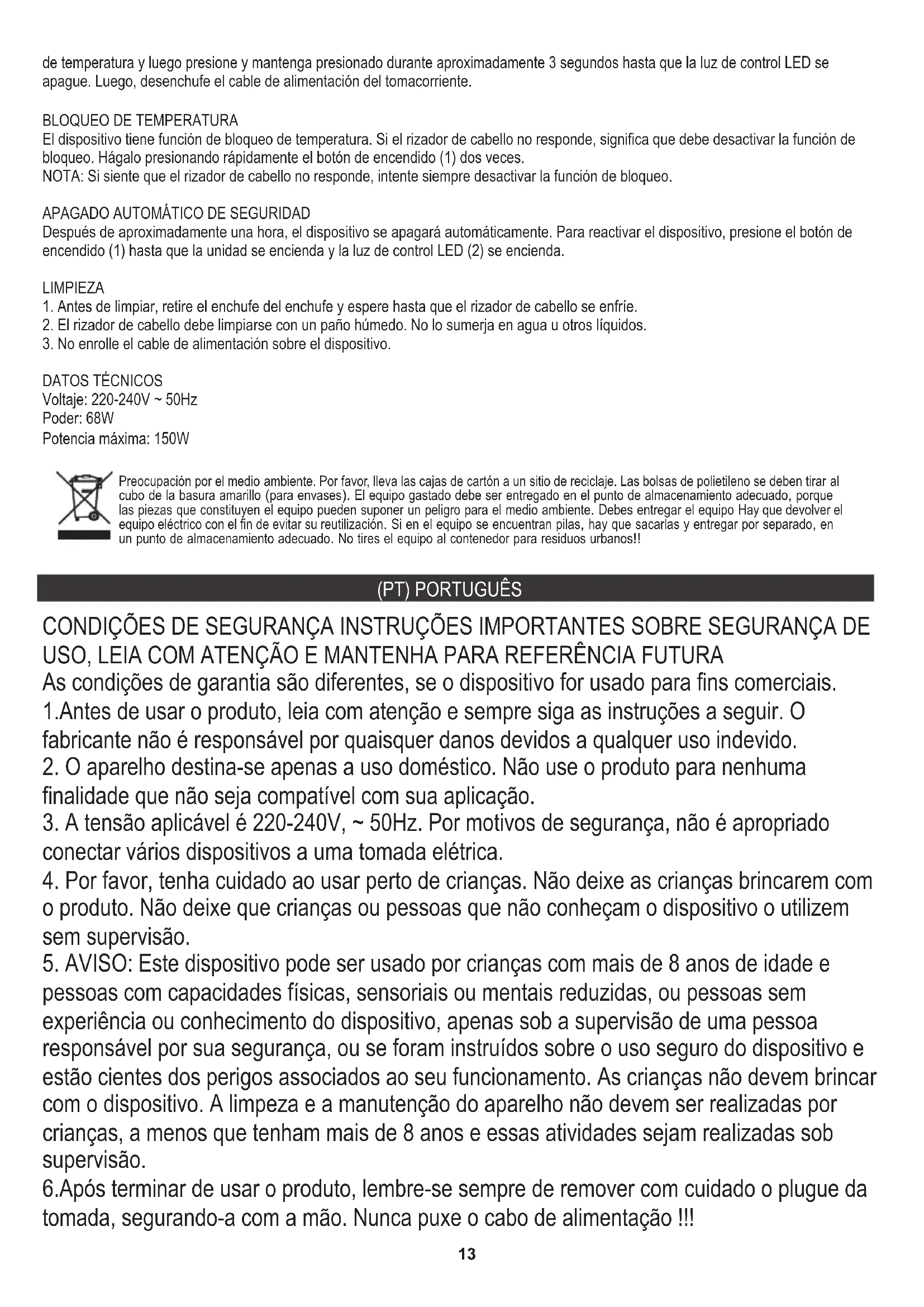 NOTA: Se você achar que o prendedor de cabelo não está respondendo, sempre tente desabilitar a função de bloqueio. Tensão: 220-240V ~ 50Hz