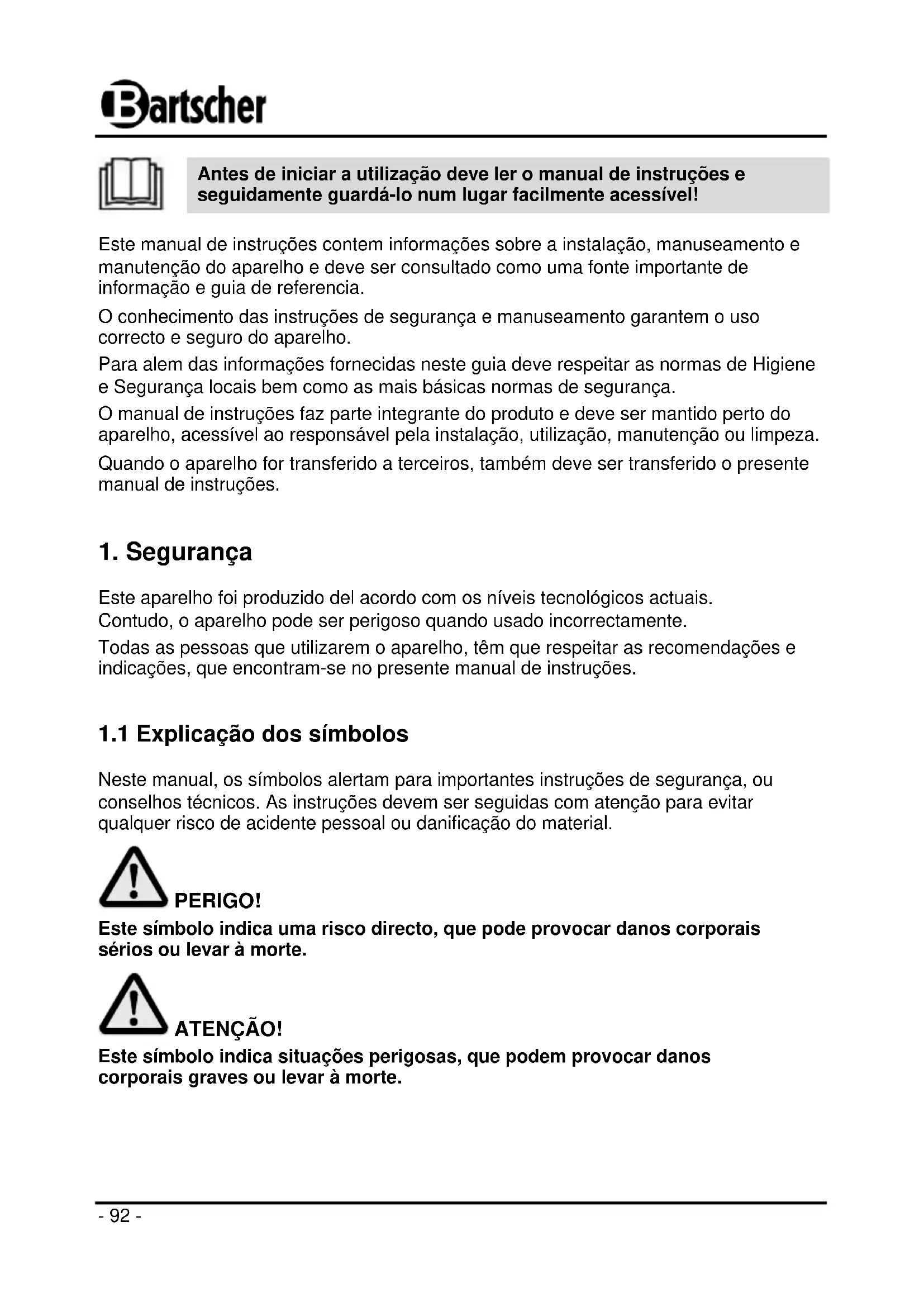 Neste manual, os símbolos alertam para importantes instruções de segurança, ou conselhos técnicos. As instruções devem ser seguidas com atenção para evitar qualquer risco de acidente pessoal ou danificação do material. PERIGO! Este símbolo indica uma risco directo, que pode provocar danos corporais sérios ou levar à morte. ATENÇÃO! Este símbolo indica situações perigosas, que podem provocar danos corporais graves ou levar à morte.- 93 -
