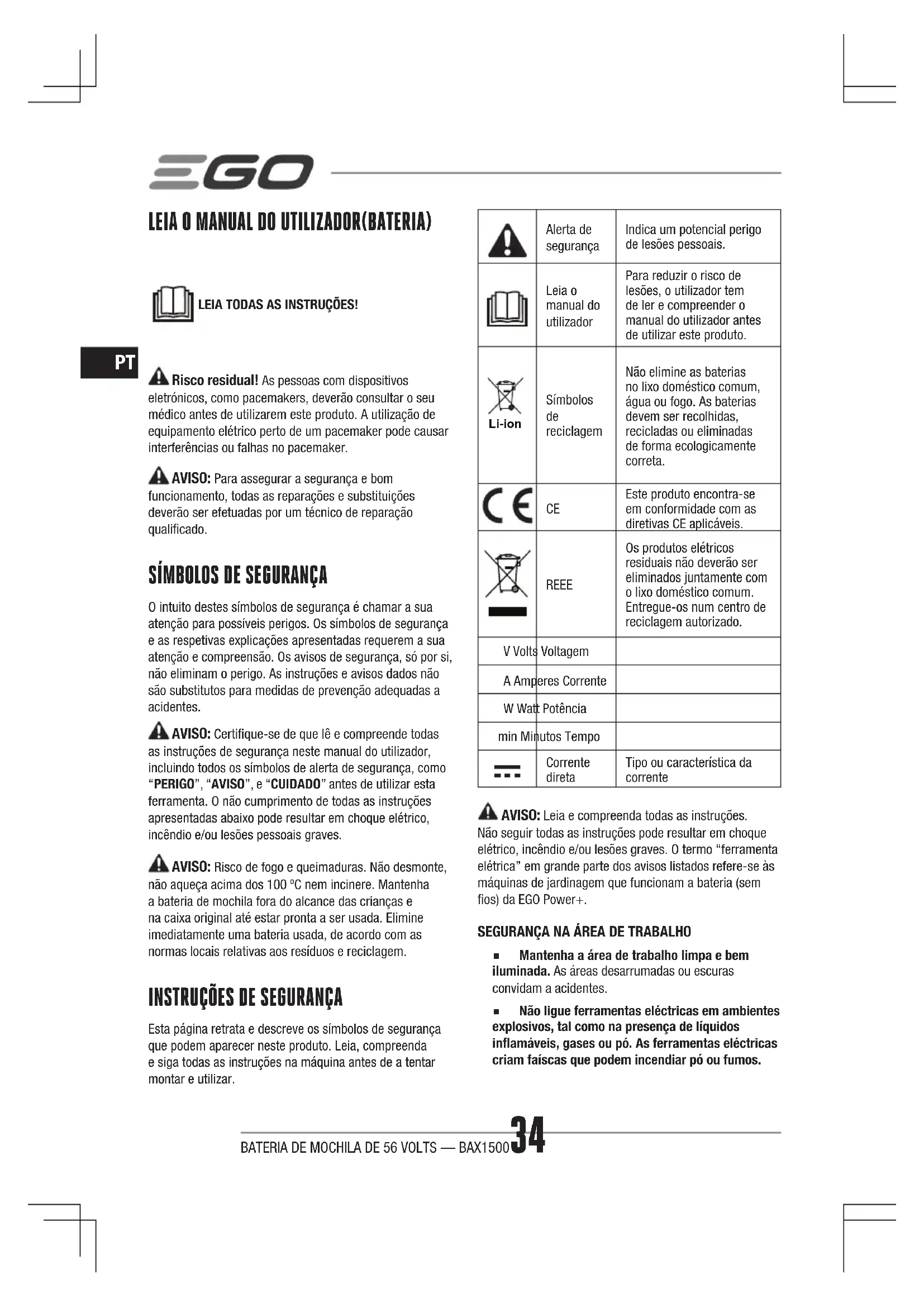 Esta página retrata e descreve os símbolos de segurança que podem aparecer neste produto. Leia, compreenda e siga todas as instruções na máquina antes de a tentar montar e utilizar.Alerta de segurançaIndica um potencial perigo de lesões pessoais.Leia o manual do utilizador Para reduzir o risco de lesões, o utilizador tem de ler e compreender o manual do utilizador antes de utilizar este produto. Li-ion Símbolos reciclagemNão elimine as baterias no lixo doméstico comum, água ou fogo. As baterias devem ser recolhidas, recicladas ou eliminadas de forma ecologicamente correta. Este produto encontra-se em conformidade com as diretivas CE aplicáveis.REEE Os produtos elétricos residuais não deverão ser eliminados juntamente com o lixo doméstico comum. Entregue-os num centro de reciclagem autorizado.V Volts VoltagemA Amperes CorrenteW Watt Potênciamin Minutos TempoCorrente diretaTipo ou característica da corrente AVISO: Leia e compreenda todas as instruções. Não seguir todas as instruções pode resultar em choque elétrico, incêndio e/ou lesões graves. O termo “ferramenta elétrica” em grande parte dos avisos listados refere-se às máquinas de jardinagem que funcionam a bateria (sem os) da EGO Power+.