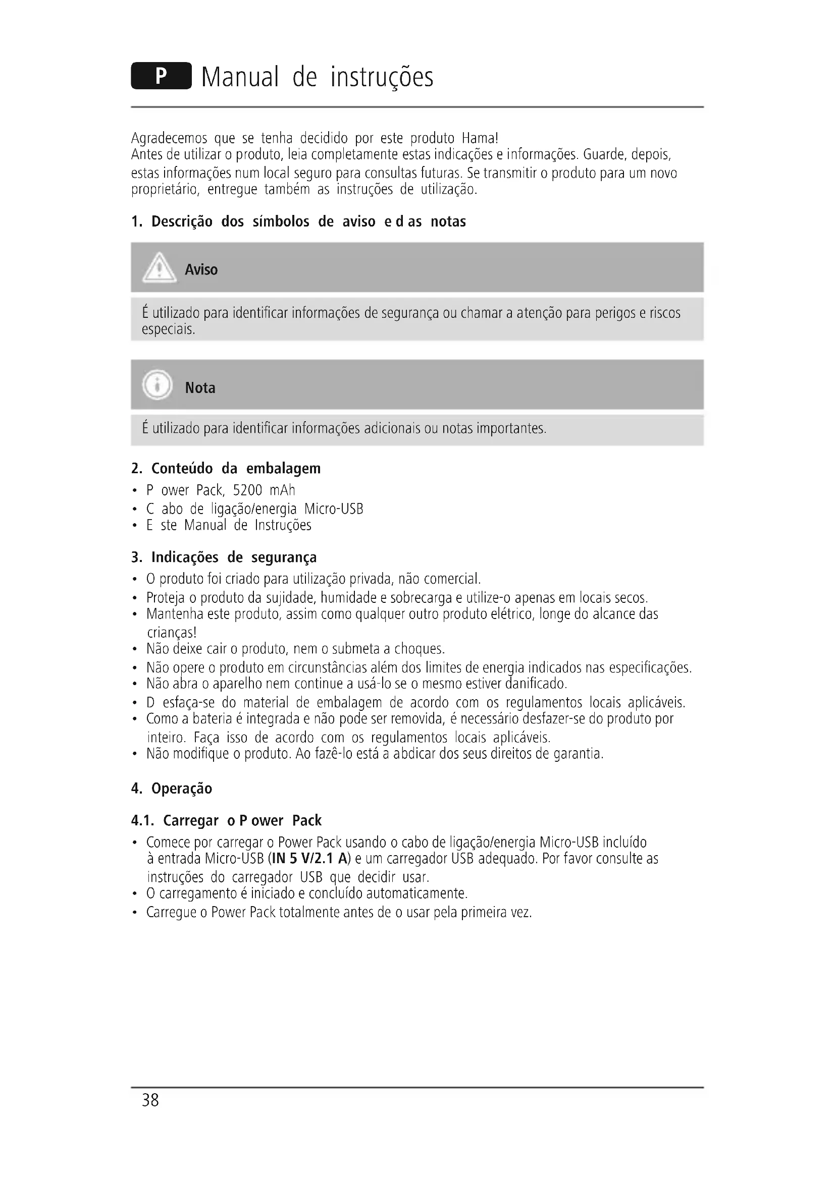 - Carregue oPower Pack totalmente antes de ousar pela primeiravez. O Manual de instruções3939 Nota –Capacidade