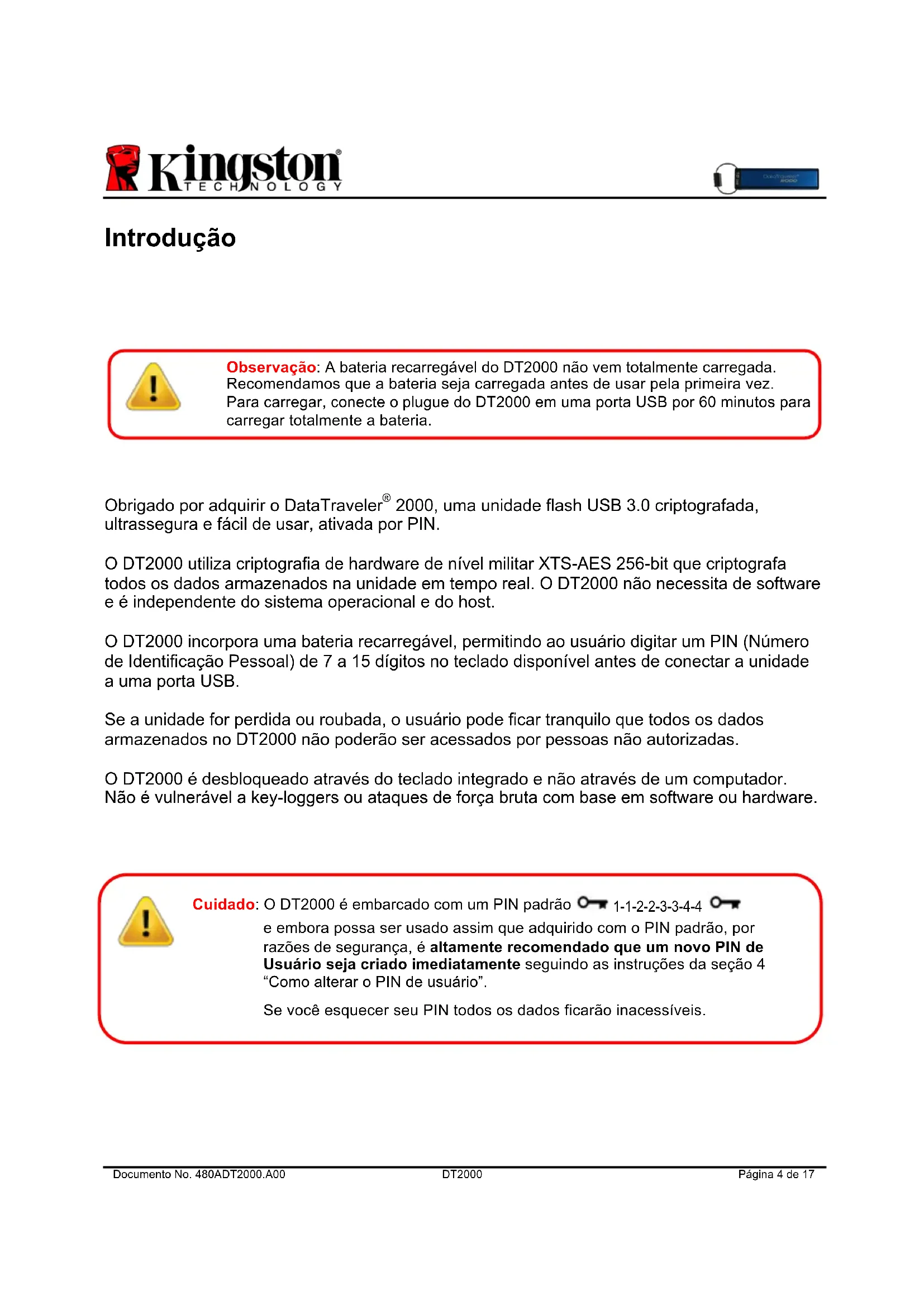 Observação: A bateria recarregável do DT2000 não vem totalmente carregada. Recomendamos que a bateria seja carregada antes de usar pela primeira vez. Para carregar, conecte o plugue do DT2000 em uma porta USB por 60 minutos para carregar totalmente a bateria. Cuidado: O DT2000 é embarcado com um PIN padrão PIN de usuário 1-1-2-2-3-3-4-4 e embora possa ser usado assim que adquirido com o PIN padrão, por razões de segurança, é altamente recomendado que um novo PIN de Usuário seja criado imediatamente seguindo as instruções da seção 4 “Como alterar o PIN de usuário”. Se você esquecer seu PIN todos os dados ficarão inacessíveis.