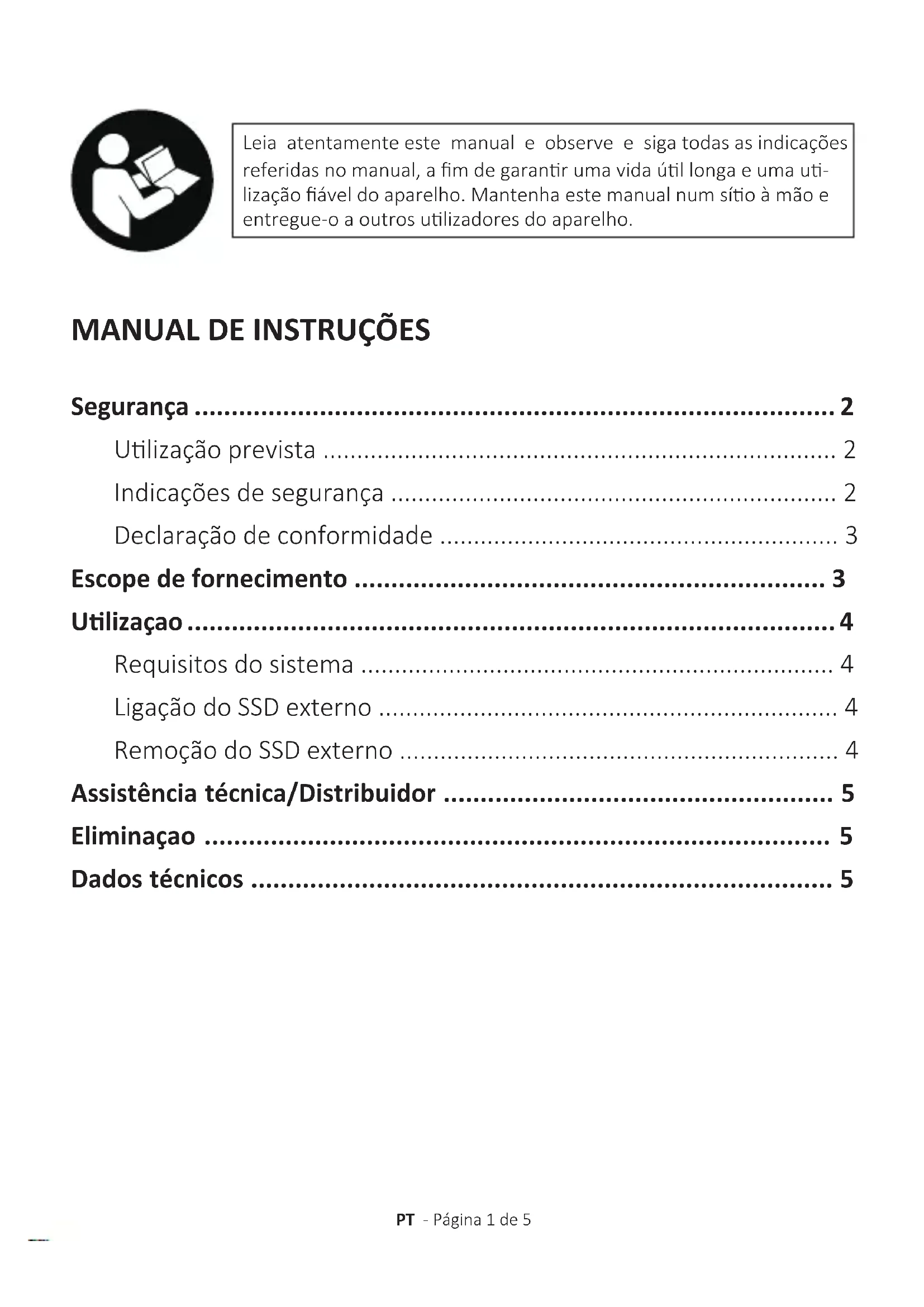 Não utilize o SSD externo sob condições ambientais extremas e respeite as indicações de segurarça. Uma inobservança das informações e indicatoroes de segurarça neste manual é considerada como desrespeito da utilizesao prevista eprovoca a extinção da responsabilitadé pode causar ferimentos ou danos materiais.