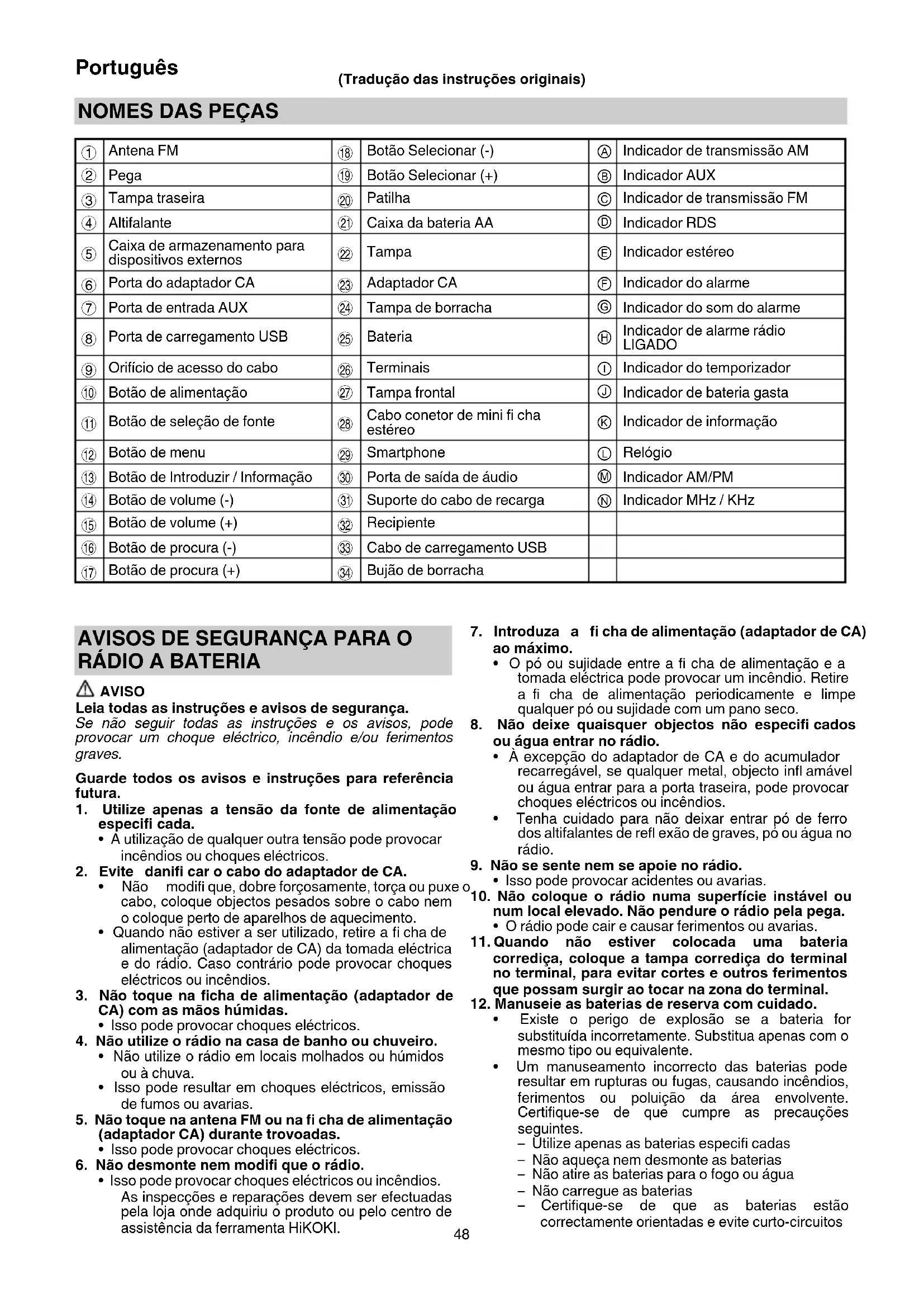 ou as conversas parecerem estar com um volume muito baixo ou difusas, pare de ouvir música e consulte um otorrinolaringologista. PRECAUÇÕES A TER AO LIGAR A EQUIPAMENTO EXTERNO Podem ocorrer problemas inesperados relacionados com a perda ou corrupção de dados armazenados em smartphones e noutros equipamentos periféricos ligados ao rádio. Tendo isso em mente, deve ser efectuada previamente uma cópia de segurança dos dados. Note que a HiKOKI não se responsabiliza pela corrupção ou perda de dados armazenados nos smartphones e noutros equipamentos periféricos ligados ao rádio nem por quaisquer danos no próprio equipamento.