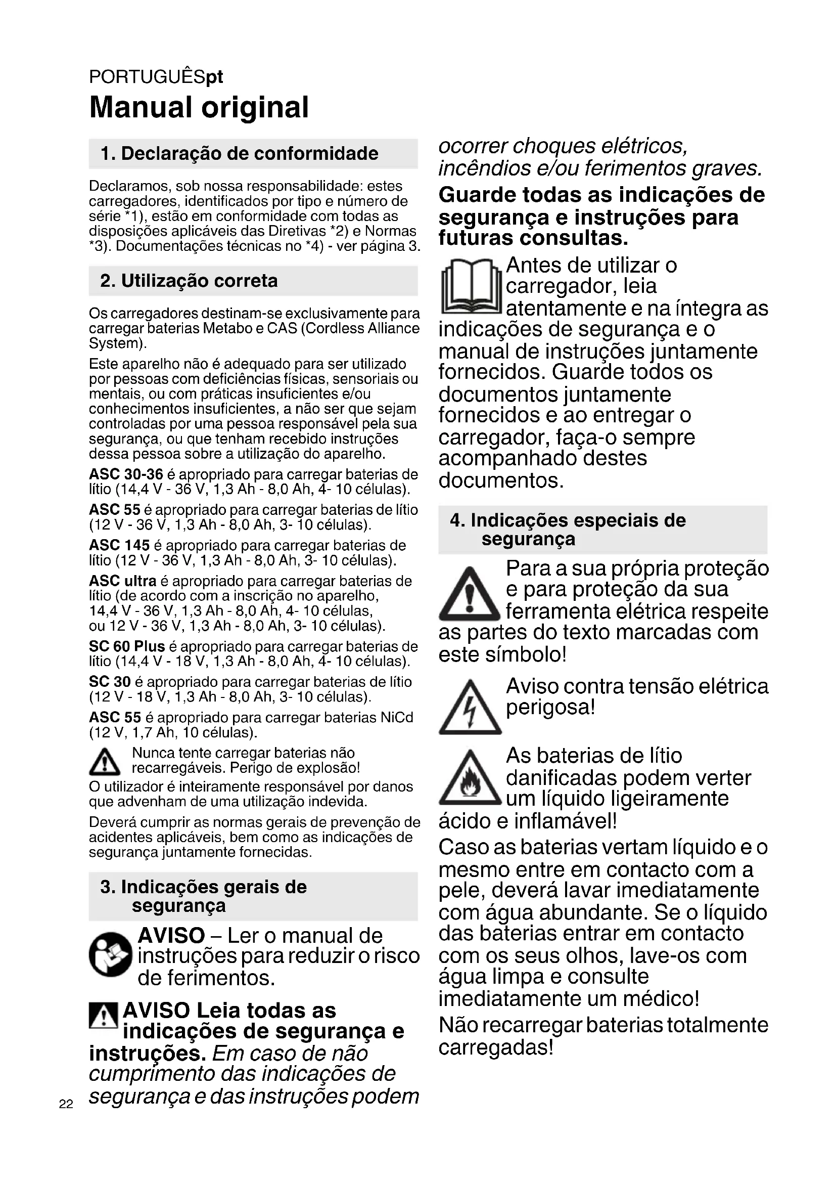 Manual original Declaramos, sob nossa responsabilidade: estes carregadores, identificados por tipo e número de série *1), estão em conformidade com todas as disposições aplicáveis das Diretivas *2) e Normas *3). Documentações técnicas no *4) - ver página 3. Os carregadores destinam-se exclusivamente para carregar baterias Metabo e CAS (Cordless Alliance System). Este aparelho não é adequado para ser utilizado por pessoas com deficiências físicas, sensoriais ou mentais, ou com práticas insuficientes e/ou conhecimentos insuficientes, a não ser que sejam controladas por uma pessoa responsável pela sua segurança, ou que tenham recebido instruções dessa pessoa sobre a utilização do aparelho. ASC 30-36 é apropriado para carregar baterias de lítio (14,4 V - 36 V, 1,3 Ah - 8,0 Ah, 4- 10 células). ASC 55 é apropriado para carregar baterias de lítio (12 V - 36 V, 1,3 Ah - 8,0 Ah, 3- 10 células). ASC 145 é apropriado para carregar baterias de lítio (12 V - 36 V, 1,3 Ah - 8,0 Ah, 3- 10 células). ASC ultra é apropriado para carregar baterias de lítio (de acordo com a inscrição no aparelho, 14,4 V - 36 V, 1,3 Ah - 8,0 Ah, 4- 10 células, ou 12 V - 36 V, 1,3 Ah - 8,0 Ah, 3- 10 células). SC 60 Plus é apropriado para carregar baterias de lítio (14,4 V - 18 V, 1,3 Ah - 8,0 Ah, 4- 10 células). SC 30 é apropriado para carregar baterias de lítio (12 V - 18 V, 1,3 Ah - 8,0 Ah, 3- 10 células). ASC 55 é apropriado para carregar baterias NiCd (12 V, 1,7 Ah, 10 células). Nunca tente carregar baterias não recarregáveis. Perigo de explosão! O utilizador é inteiramente responsável por danos que advenham de uma utilização indevida. Deverá cumprir as normas gerais de prevenção de acidentes aplicáveis, bem como as indicações de segurança juntamente fornecidas. AVISO – Ler o manual de instruções para reduzir o risco de ferimentos. AVISO Leia todas as indicações de segurança e instruções. Em caso de não cumprimento das indicações de segurança e das instruções podem ocorrer choques elétricos, incêndios e/ou ferimentos graves. Guarde todas as indicações de segurança e instruções para futuras consultas. Antes de utilizar o carregador, leia atentamente e na íntegra as indicações de segurança e o manual de instruções juntamente fornecidos. Guarde todos os documentos juntamente fornecidos e ao entregar o carregador, faça-o sempre acompanhado destes documentos. Para a sua própria proteção e para proteção da sua ferramenta elétrica respeite as partes do texto marcadas com este símbolo! Aviso contra tensão elétrica perigosa! As baterias de lítio danificadas podem verter um líquido ligeiramente ácido e inflamável! Caso as baterias vertam líquido e o mesmo entre em contacto com a pele, deverá lavar imediatamente com água abundante. Se o líquido das baterias entrar em contacto com os seus olhos, lave-os com água limpa e consulte imediatamente um médico! Não recarregar baterias totalmente carregadas!