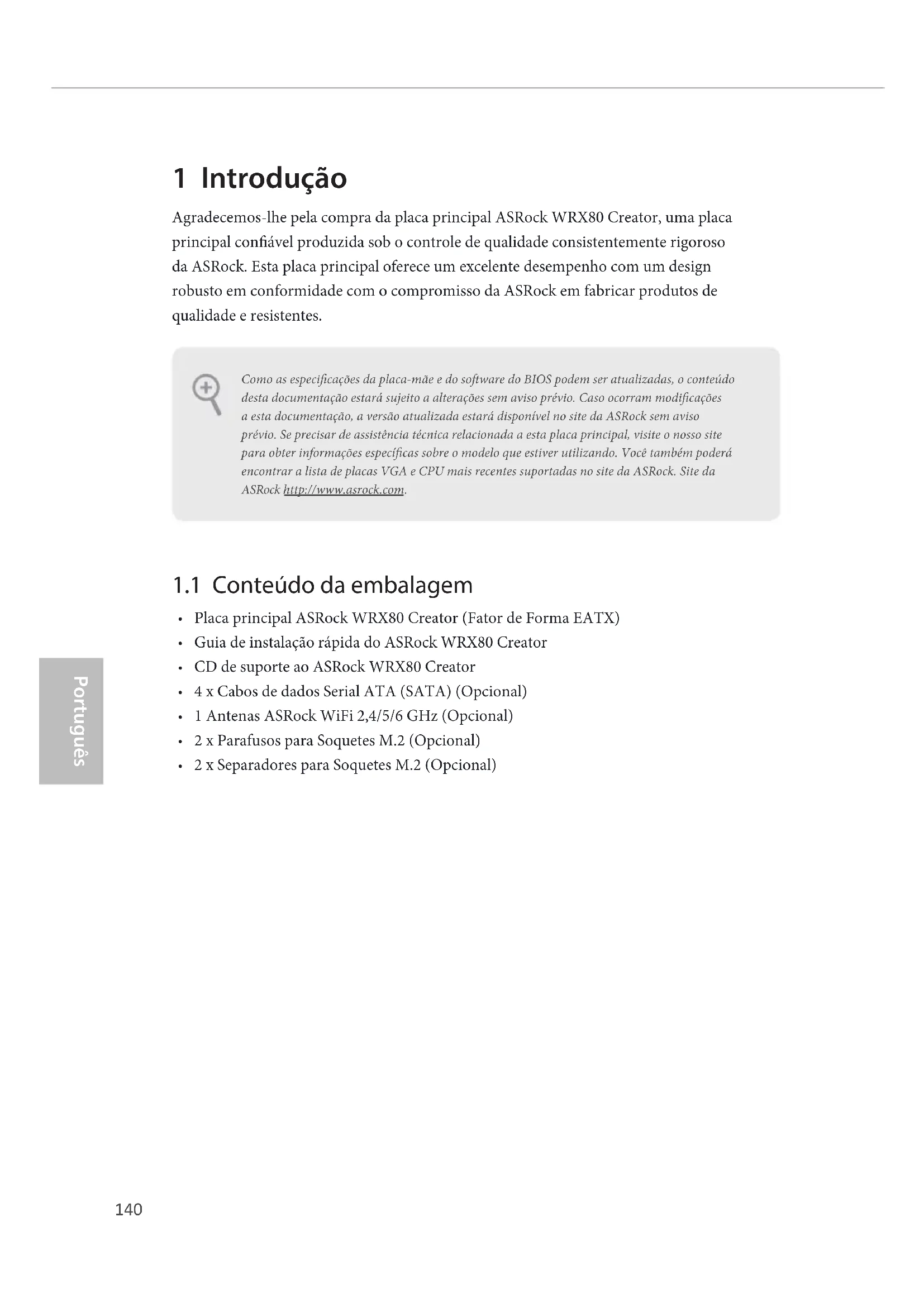 2 x Separadores para Soquetes M.2 (Opcional) Como as especicações da placa-mãe e do soware do BIOS podem ser atualizadas, o conteúdo desta documentação estará sujeito a alterações sem aviso prévio. Caso ocorram modicações a esta documentação, a versão atualizada estará disponível no site da ASRock sem aviso prévio. Se precisar de assistência técnica relacionada a esta placa principal, visite o nosso site para obter informações especícas sobre o modelo que estiver utilizando. Você também poderá encontrar a lista de placas VGA e CPU mais recentes suportadas no site da ASRock. Site da ASRock http://www.asrock.com.141 WRX80 Creator Português