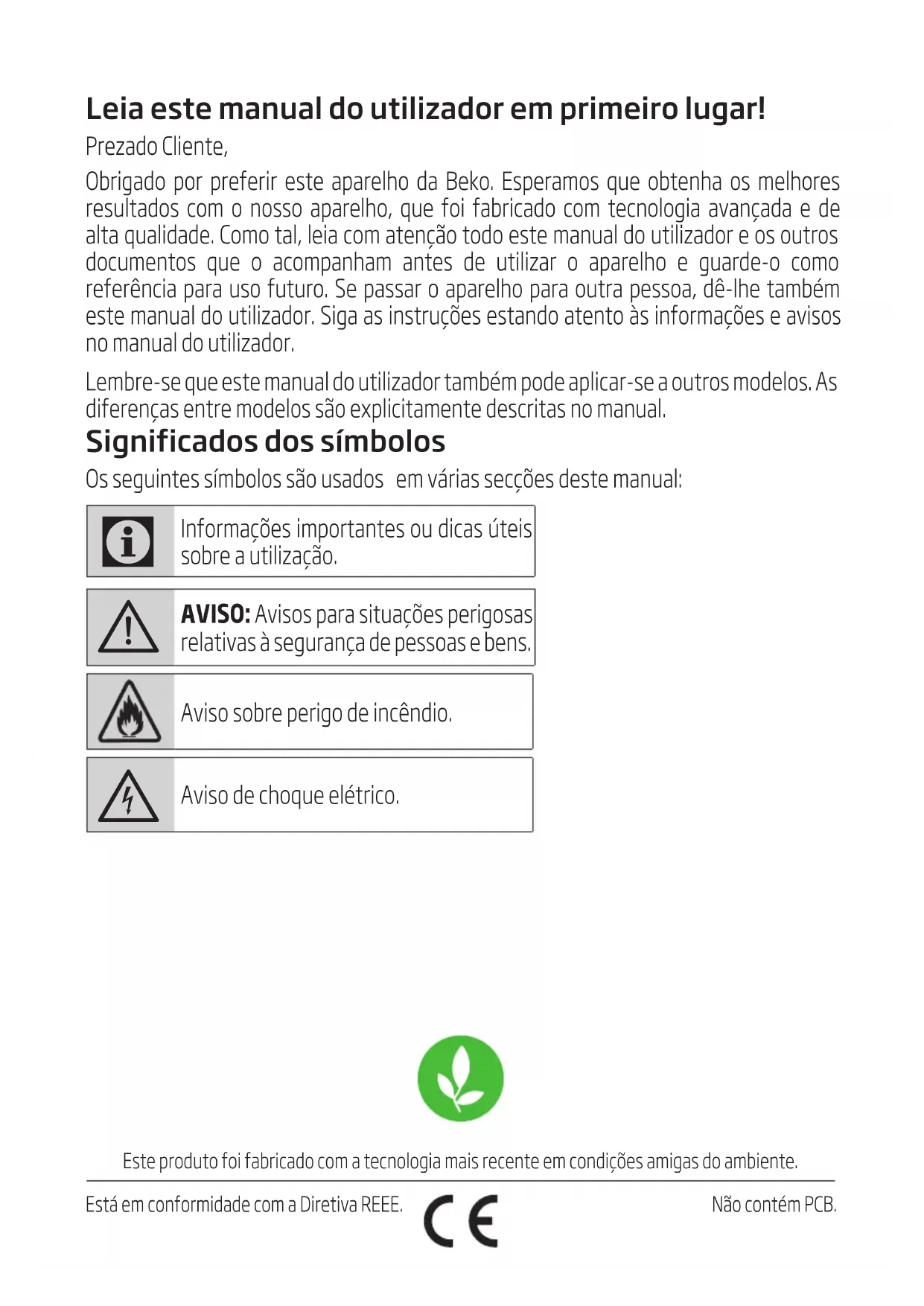 DepanareaEstá em conformdade com a Dretva REEE. Este produto fo fabrcado com a tecnologa mas recente em condções amgas do ambente. Leia este manual do utilizador em primeiro lugar! Prezado Cliente, Obrigado por preferir este aparelho da Beko. Esperamos que obtenha os melhores resultados com o nosso aparelho, que foi fabricado com tecnologia avançada e de alta qualidade. Como tal, leia com atenção todo este manual do utilizador e os outros documentos que o acompanham antes de utilizar o aparelho e guarde-o como referência para uso futuro. Se passar o aparelho para outra pessoa, dê-lhe também este manual do utilizador. Siga as instruções estando atento às informações e avisos no manual do utilizador. Lembre-se que este manual do utilizador também pode aplicar-se a outros modelos. As diferenças entre modelos são explicitamente descritas no manual. Significados dos símbolos Os seguintes símbolos são usados em várias secções deste manual: