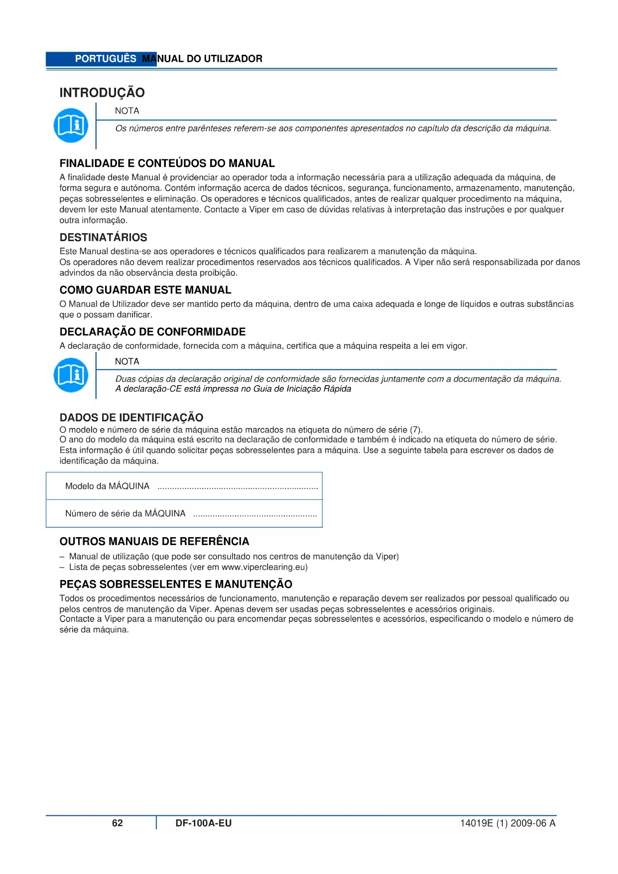 A finalidade deste Manual é providenciar ao operador toda a informação necessária para a utilização adequada da máquina, de forma segura e autónoma. Contém informação acerca de dados técnicos, segurança, funcionamento, armazenamento, manutenção, peças sobresselentes e eliminação. Os operadores e técnicos qualificados, antes de realizar qualquer procedimento na máquina, devem ler este Manual atentamente. Contacte a Viper em caso de dúvidas relativas à interpretação das instruções e por qualquer outra informação. DESTINATÁRIOS Este Manual destina-se aos operadores e técnicos qualificados para realizarem a manutenção da máquina. Os operadores não devem realizar procedimentos reservados aos técnicos qualificados. A Viper não será responsabilizada por danos advindos da não observância desta proibição.