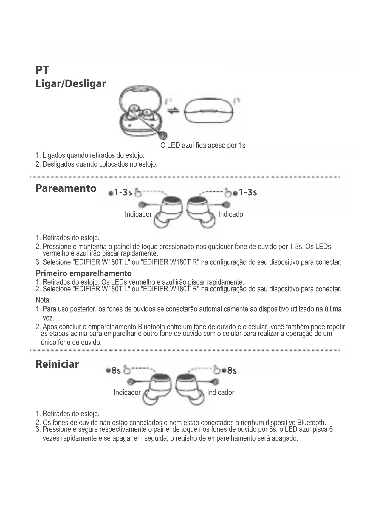 Reiniciar 1. Retirados do estojo.2. Os fones de ouvido não estão conectados e nem estão conectados a nenhum dispositivo Bluetooth.3. Pressione e segure respectivamente o painel de toque nos fones de ouvido por 8s, o LED azul pisca 6 vezes rapidamente e se apaga, em seguida, o registro de emparelhamento será apagado. O LED azul fica aceso por 1sx2