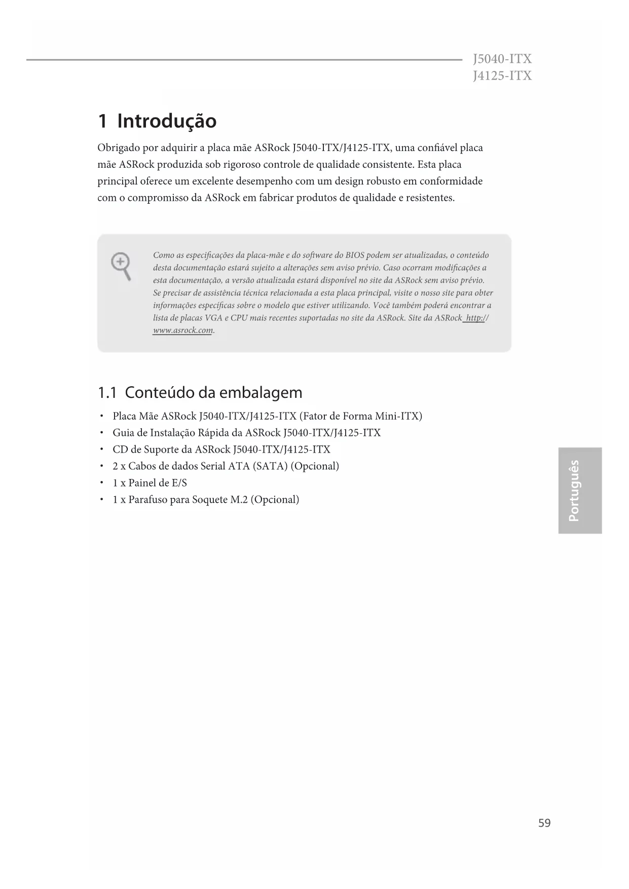 AN_VOLTAGE59 Português J5040-ITX J4125-ITX 1 Introdução Obrigado por adquirir a placa mãe ASRock J5040-ITX/J4125-ITX, uma conável placa mãe ASRock produzida sob rigoroso controle de qualidade consistente. Esta placa principal oferece um excelente desempenho com um design robusto em conformidade com o compromisso da ASRock em fabricar produtos de qualidade e resistentes.