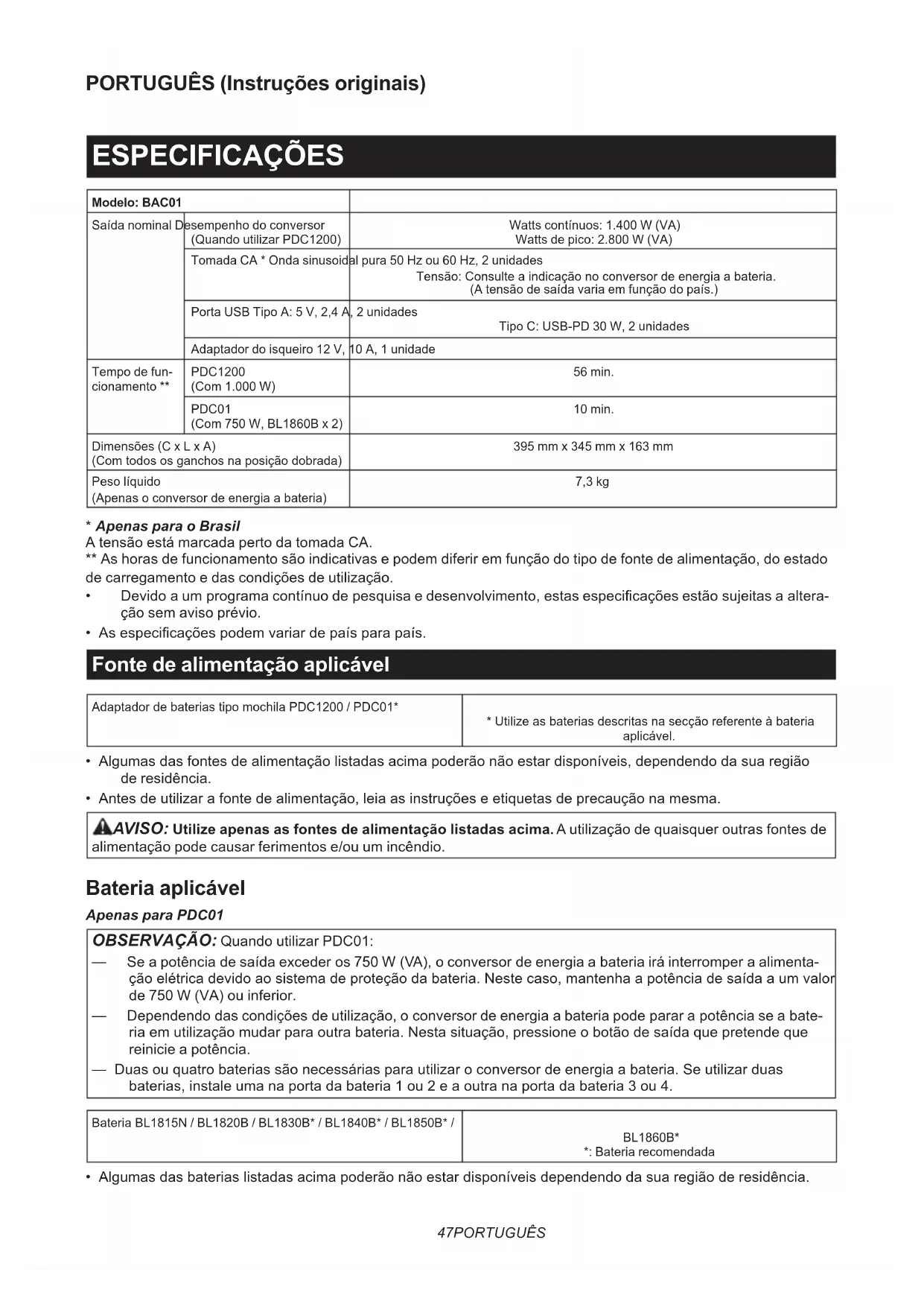 - MAKPAC NOTA: Algunos elementos de la lista podrán estar incluidos en el paquete de la herramienta como acce- sorios estándar. Pueden variar de un país a otro.47 PORTUGUÊS PORTUGUÊS (Instruções originais) ESPECIFICAÇÕES Modelo: BAC01 Saída nominal Desempenho do conversor (Quando utilizar PDC1200) Watts contínuos: 1.400 W (VA) Watts de pico: 2.800 W (VA) Tomada CA * Onda sinusoidal pura 50 Hz ou 60 Hz, 2 unidades Tensão: Consulte a indicação no conversor de energia a bateria. (A tensão de saída varia em função do país.) Porta USB Tipo A: 5 V, 2,4 A, 2 unidades Tipo C: USB-PD 30 W, 2 unidades Adaptador do isqueiro 12 V, 10 A, 1 unidade Tempo de fun- cionamento ** PDC1200 (Com 1.000 W) 56 min. PDC01 (Com 750 W, BL1860B x 2) 10 min. Dimensões (C x L x A) (Com todos os ganchos na posição dobrada) 395 mm x 345 mm x 163 mm Peso líquido (Apenas o conversor de energia a bateria) 7,3 kg