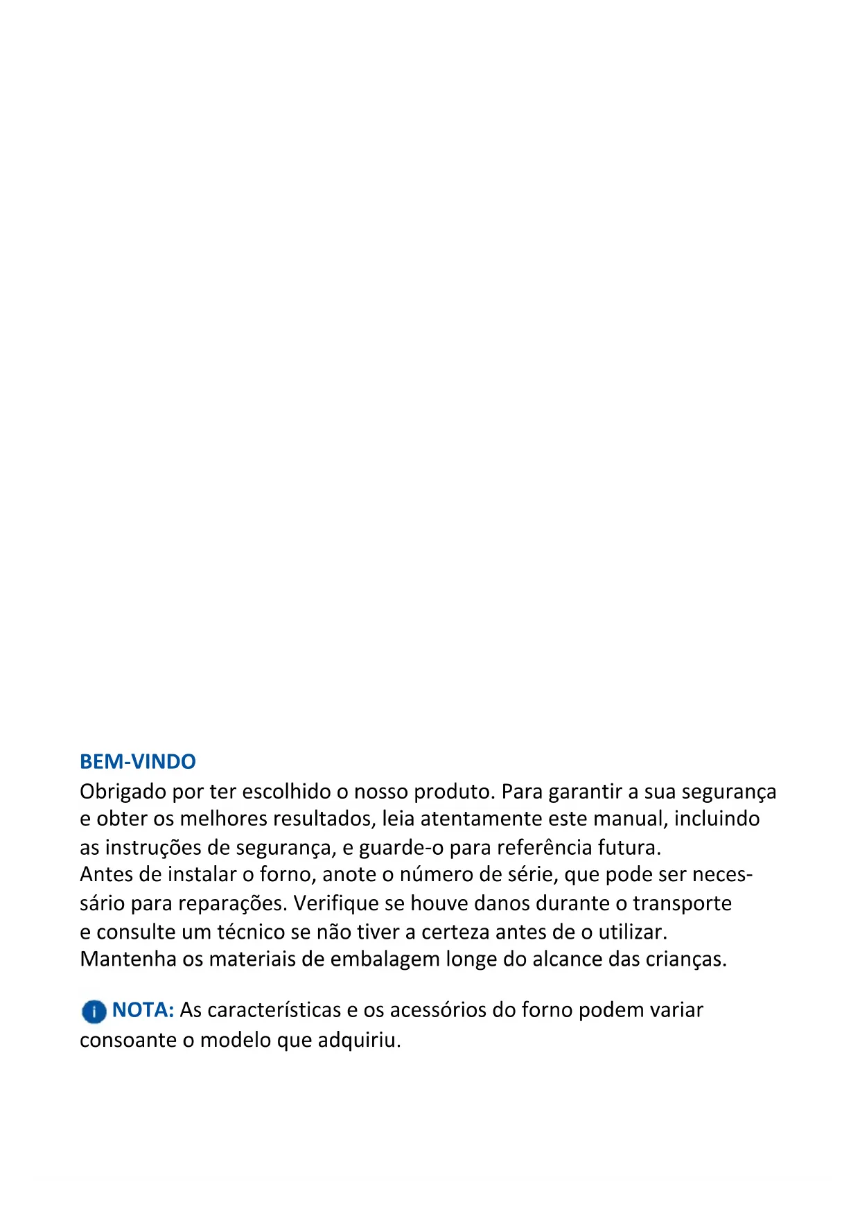 mmBEM-VINDO Obrigado por ter escolhido o nosso produto. Para garantir a sua segurança e obter os melhores resultados, leia atentamente este manual, incluindo as instruções de segurança, e guarde-o para referência futura. Antes de instalar o forno, anote o número de série, que pode ser neces- sário para reparações. Verifique se houve danos durante o transporte e consulte um técnico se não tiver a certeza antes de o utilizar. Mantenha os materiais de embalagem longe do alcance das crianças. NOTA: As características e os acessórios do forno podem variar consoante o modelo que adquiriu.RESUMO