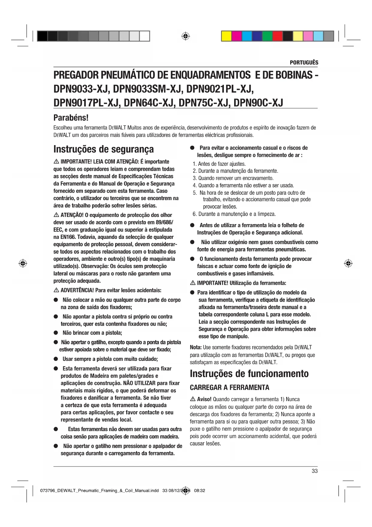 m Aviso! Quando carregar a ferramenta 1) Nunca coloque as mãos ou qualquer parte do corpo na área de descarga dos fixadores da ferramenta; 2) Nunca aponte a ferramenta para si ou para qualquer outra pessoa; 3) Não puxe o gatilho nem pressione o apalpador de segurança pois pode ocorrer um accionamento acidental, que poderá causar lesões. PREGADOR PNEUMÁTICO DE ENQUADRAMENTOS E DE BOBINAS - DPN9033-XJ, DPN9033SM-XJ, DPN9021PL-XJ, DPN9017PL-XJ, DPN64C-XJ, DPN75C-XJ, DPN90C-XJ Parabéns! Escolheu uma ferramenta DEWALT Muitos anos de experiência, desenvolvimento de produtos e espírito de inovação fazem de DEWALT um dos parceiros mais fiáveis para utilizadores de ferramentas eléctricas profissionais. 073796_DEWALT_Pneumatic_Framing_&_Coil_Manual.indd 33 08/12/2016 08:32PORTUGUÊS