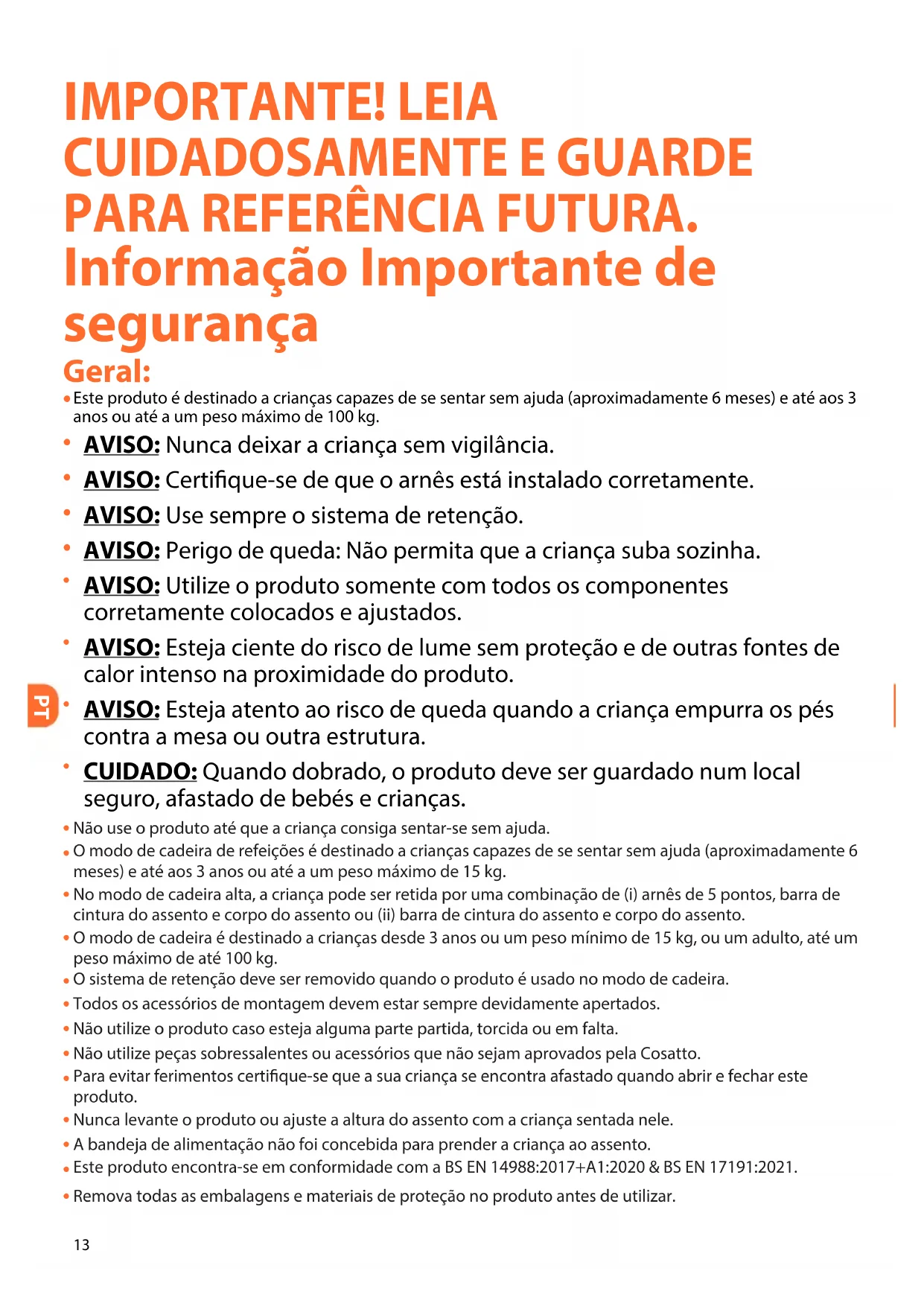 Não use o produto até que a criança consiga sentar-se sem ajuda. O modo de cadeira de refeições é destinado a crianças capazes de se sentar sem ajuda (aproximadamente 6 meses) e até aos 3 anos ou até a um peso máximo de 15 kg. No modo de cadeira alta, a criança pode ser retida por uma combinação de (i) arnês de 5 pontos, barra de cintura do assento e corpo do assento ou (ii) barra de cintura do assento e corpo do assento. O modo de cadeira é destinado a crianças desde 3 anos ou um peso mínimo de 15 kg, ou um adulto, até um peso máximo de até 100 kg. O sistema de retenção deve ser removido quando o produto é usado no modo de cadeira. Todos os acessórios de montagem devem estar sempre devidamente apertados. Não utilize o produto caso esteja alguma parte partida, torcida ou em falta. Não utilize peças sobressalentes ou acessórios que não sejam aprovados pela Cosatto. Para evitar ferimentos certique-se que a sua criança se encontra afastado quando abrir e fechar este produto. Nunca levante o produto ou ajuste a altura do assento com a criança sentada nele. A bandeja de alimentação não foi concebida para prender a criança ao assento. Este produto encontra-se em conformidade com a BS EN 14988:2017+A1:2020 & BS EN 17191:2021. Remova todas as embalagens e materiais de proteção no produto antes de utilizar.14 Lista de Peças: Por favor, consulte os diagramas: A Forro do apoio de costas K Painel do assento B Forro de assento L Barra de apoio C Bandeja exterior M Painel de pés D Bandeja interior N Descanso para pés E Montagem de perna traseira O Arnês F Armação lateral direita P Corpo do assento G Armação lateral esquerda Q Cobertura da dobradiça direita H Apoio de costas superior R Cobertura da dobradiça esquerda I Apoio de costas inferior S Montagem da bandeja direita J Barra de cintura do assento T Montagem da bandeja esquerda Pacote de xação I Parafuso longo (50mm) x 6 VI Parafuso de corpo do assento x 2 II Parafuso médio (35mm) x 4 VII Parafuso de dobradiça x 2 III Parafuso curto (30mm) x 4 VIII Porca Nyloc x 4 IV Parafuso de montagem da bandeja x 4 IX Chave de fenda V Porca de tambor x 8 X Chave allen Peças de Substituição: As peças de substituição mostradas abaixo encontram-se disponíveis para o seu produto. Para os clientes do Reino Unido e Irlanda, encomendas através do nosso website: http://www.cosatto.com/service-centre/spares Para os clientes do Reino Unido e Irlanda, a informação de contacto para o seu distribuidor local encontra-se em http://www.cosatto.com/stockists Se precisar de mais assistência, queira contactar-nos através do cuddle@cosatto.com A Forro do apoio de costas K Painel do assento B Forro de assento L Barra de apoio C Bandeja exterior M Painel de pés D Bandeja interior N Descanso para pés E Montagem de perna traseira O Arnês F Armação lateral direita P Corpo do assento G Armação lateral esquerda Q Cobertura da dobradiç (Conjunto) H Apoio de costas superior R Montagem da bandeja (Conjunto) I Apoio de costas inferior S Pacote de xação J Barra de cintura do assento