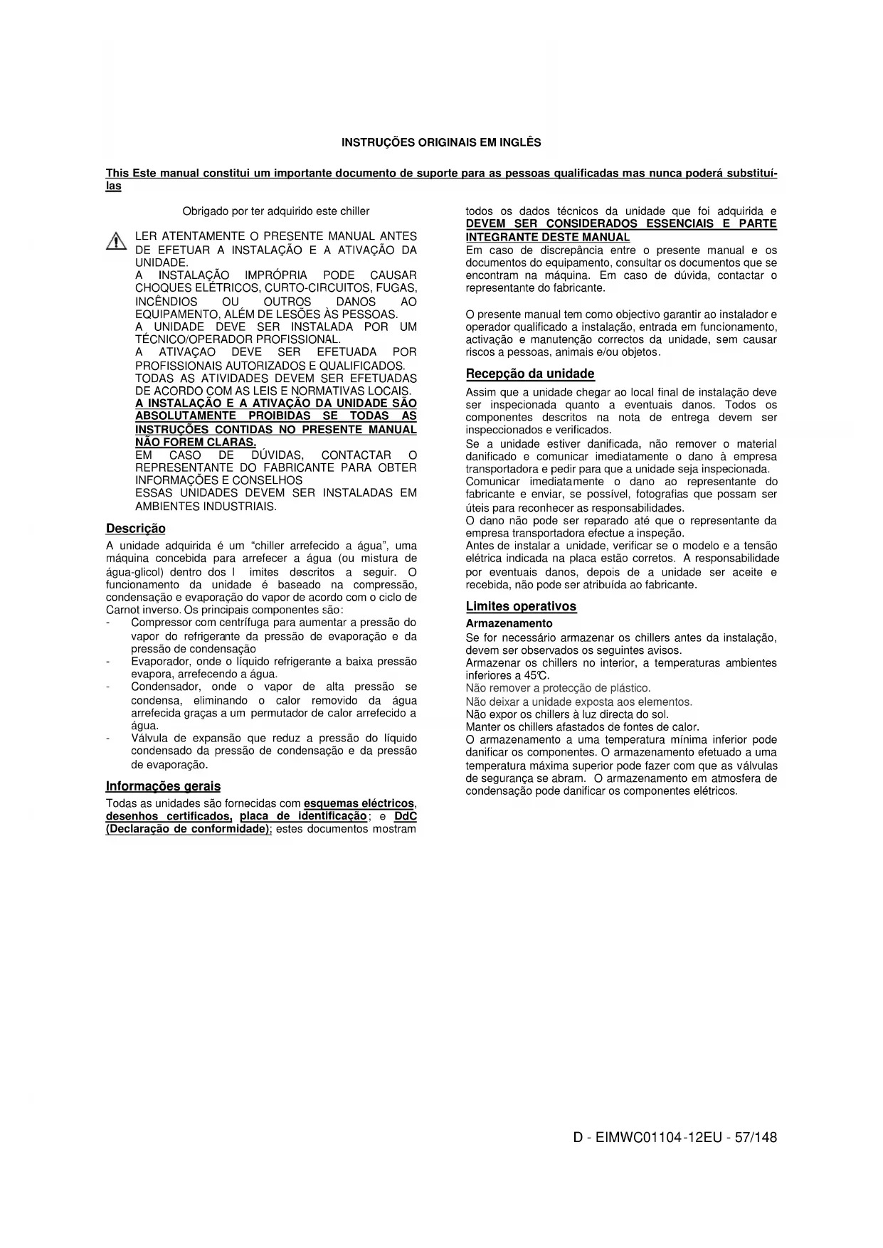 encomenda, a capacidade do fluxo de água do evaporador nunca deve ser superior a 120% e inferior a 80% da capacidade nominal. Controlos obrigatórios periódicos e inicialização de aparelhos sob pressão As unidades estão incluídas na categoria IV da classificação estabelecida pela Directiva Europeia PED 97/23/EC. Para os chillers pertencentes a esta categoria, algumas normativas locais requerem uma inspeção periódica realizada por uma agência autorizada. Verificar os requisitos em vigor no local de instalação Informações importantes relativas ao refrigerante utilizado Este produto contém gases fluorados com efeito de estufa abrangidos pelo Protocolo de Quito. Não eliminar os gases na atmosfera. Tipo de refrigerante: R134a Valor GWP (1): 1300 (1) GWP = potencial de aquecimento global A quantidade de refrigerante necessária para o funcionamento padrão é indicada na placa de identificação da unidade. A quantidade de refrigerante real carregada na unidade é mostrada numa etiqueta prateada situada no interior do painel elétrico. De acordo com o que foi disposto pela legislação europeia ou local, podem ser necessárias inspecções periódicas para verificar eventuais fugas de refrigerante. Contactar o revendedor local para mais informações. Eliminação A unidade é fabricada com componentes metálicos, plásticos e electrónicos. Todos estes componentes devem ser eliminados em conformidade com as normativas locais em vigor sobre o assunto. As baterias de chumbo devem ser recolhidas e enviadas para centros específicos de recolha de resíduos. O óleo deve ser recolhido e enviado para centros específicos de recolha de resíduosD - EIMWC01104-12EU - 62/148