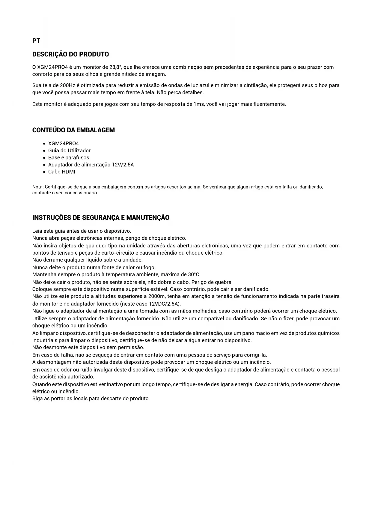 - Cabo HDMI Nota: Certifique-se de que a sua embalagem contém os artigos descritos acima. Se verificar que algum artigo está em falta ou danificado, contacte o seu concessionário. INSTRUÇÕES DE SEGURANÇA E MANUTENÇÃO Leia este guia antes de usar o dispositivo. Nunca abra peças eletrônicas internas, perigo de choque elétrico. Não insira objetos de qualquer tipo na unidade através das aberturas eletrónicas, uma vez que podem entrar em contacto com pontos de tensão e peças de curto-circuito e causar incêndio ou choque elétrico. Não derrame qualquer líquido sobre a unidade. Nunca deite o produto numa fonte de calor ou fogo. Mantenha sempre o produto à temperatura ambiente, máxima de 30°C. Não deixe cair o produto, não se sente sobre ele, não dobre o cabo. Perigo de quebra. Coloque sempre este dispositivo numa superfície estável. Caso contrário, pode cair e ser danificado. Não utilize este produto a altitudes superiores a 2000m, tenha em atenção a tensão de funcionamento indicada na parte traseira do monitor e no adaptador fornecido (neste caso 12VDC/2.5A). Não ligue o adaptador de alimentação a uma tomada com as mãos molhadas, caso contrário poderá ocorrer um choque elétrico. Utilize sempre o adaptador de alimentação fornecido. Não utilize um compatível ou danificado. Se não o fizer, pode provocar um choque elétrico ou um incêndio. Ao limpar o dispositivo, certifique-se de desconectar o adaptador de alimentação, use um pano macio em vez de produtos químicos industriais para limpar o dispositivo, certifique-se de não deixar a água entrar no dispositivo. Não desmonte este dispositivo sem permissão. Em caso de falha, não se esqueça de entrar em contato com uma pessoa de serviço para corrigi-la. A desmontagem não autorizada deste dispositivo pode provocar um choque elétrico ou um incêndio. Em caso de odor ou ruído invulgar deste dispositivo, certifique-se de que desliga o adaptador de alimentação e contacta o pessoal de assistência autorizado. Quando este dispositivo estiver inativo por um longo tempo, certifique-se de desligar a energia. Caso contrário, pode ocorrer choque elétrico ou incêndio. Siga as portarias locais para descarte do produto.ENTRADAS E SAÍDAS Entrada HDMI Se o seu PC tiver saída de vídeo HDMI, ligue o cabo HDMI fornecido entre a entrada HDMI do monitor e a saída HDMI do PC. Esta entrada é HDMI versão 2.0. Entrada DisplayPort Se o seu PC tiver uma saída de vídeo DP, adquira um cabo DP e ligue-o entre a entrada DP do monitor e a saída DP do PC. Esta entrada é DP versão 1.2. Entrada DC Ligue o cabo da fonte de alimentação fornecida à entrada CC do Monitor e ligue o adaptador a uma tomada elétrica doméstica. Fonte de alimentação 12V/2.5A. Saída USB Se desejar carregar ou alimentar um dispositivo como smartphones, tablets, etc., pode fazê-lo utilizando a sua saída USB 5V/1A. Saída jack de 3,5 mm Ligue um auscultador à saída jack de 3,5 mm do monitor para ouvir áudio diretamente a partir desta saída.