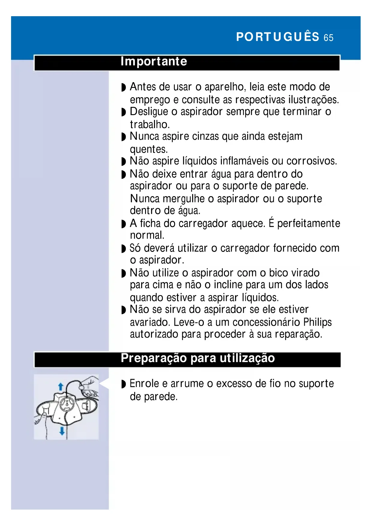 - Não se sirva do aspirador se ele estiver avariado. Leve-o a um concessionário Philips autorizational para proceder à sua reparação.
