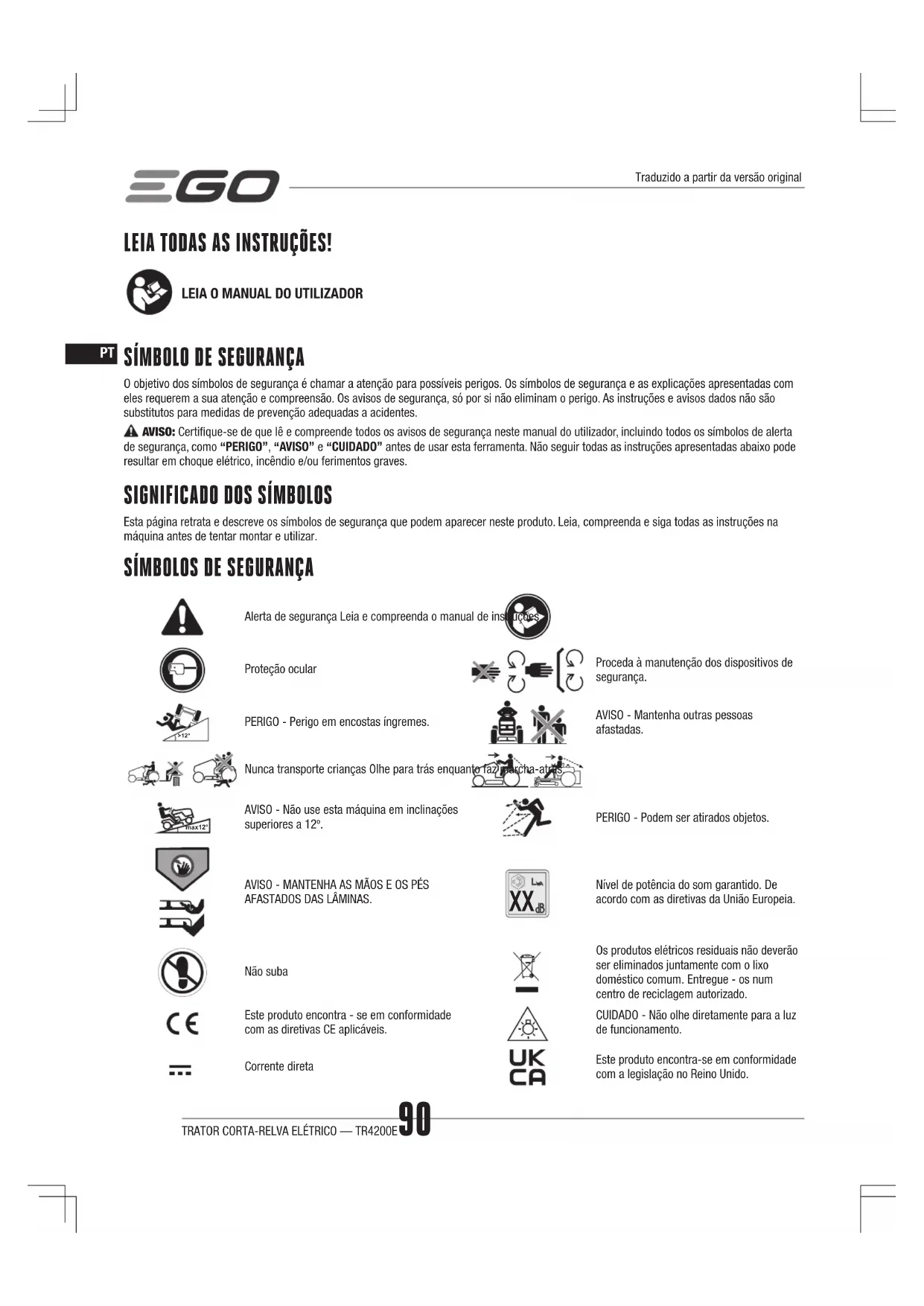 Alerta de segurança Leia e compreenda o manual de instruções.Proteção ocularProceda à manutenção dos dispositivos de segurança.>12°PERIGO - Perigo em encostas íngremes.AVISO - Mantenha outras pessoas afastadas.Nunca transporte crianças Olhe para trás enquanto faz marcha-atrás.max12°AVISO - Não use esta máquina em inclinações superiores a 12º.PERIGO - Podem ser atirados objetos.AVISO - MANTENHA AS MÃOS E OS PÉS AFASTADOS DAS LÂMINAS. Nível de potência do som garantido. De acordo com as diretivas da União Europeia.Não subaOs produtos elétricos residuais não deverão ser eliminados juntamente com o lixo doméstico comum. Entregue - os num centro de reciclagem autorizado.Este produto encontra - se em conformidade com as diretivas CE aplicáveis.CUIDADO - Não olhe diretamente para a luz de funcionamento.Corrente diretaEste produto encontra-se em conformidade com a legislação no Reino Unido.Traduzido a partir da versão original91TRATOR CORTA-RELVA ELÉTRICO — TR4200E