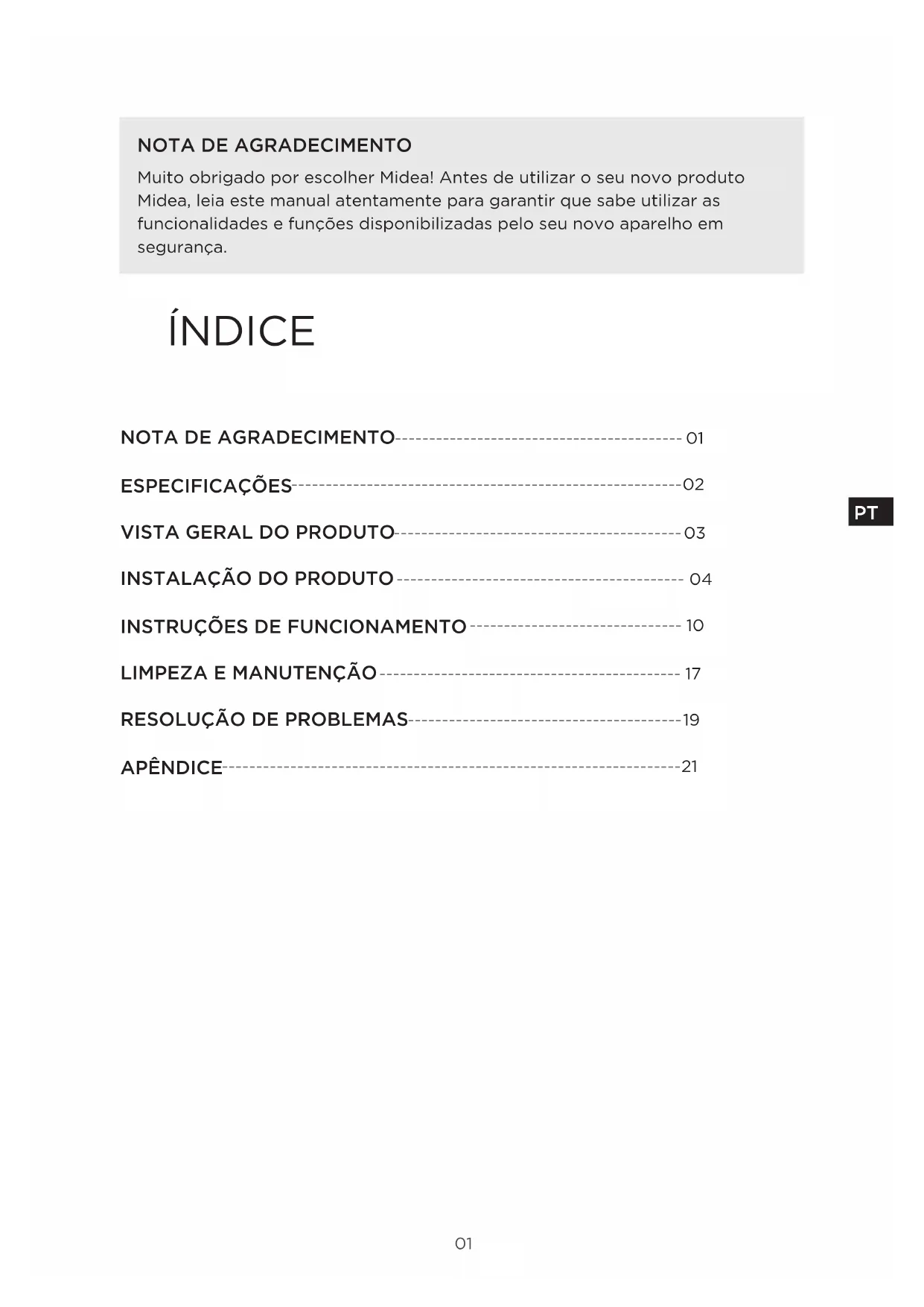 Muito obrigado por escolher Midea! Antes de utilizar o seu novo produto Midea, leia este manual atentamente para garantir que sabe utilizar as funcionalidades e funções disponibilizadas pelo seu novo aparelho em segurança. ÍNDICE