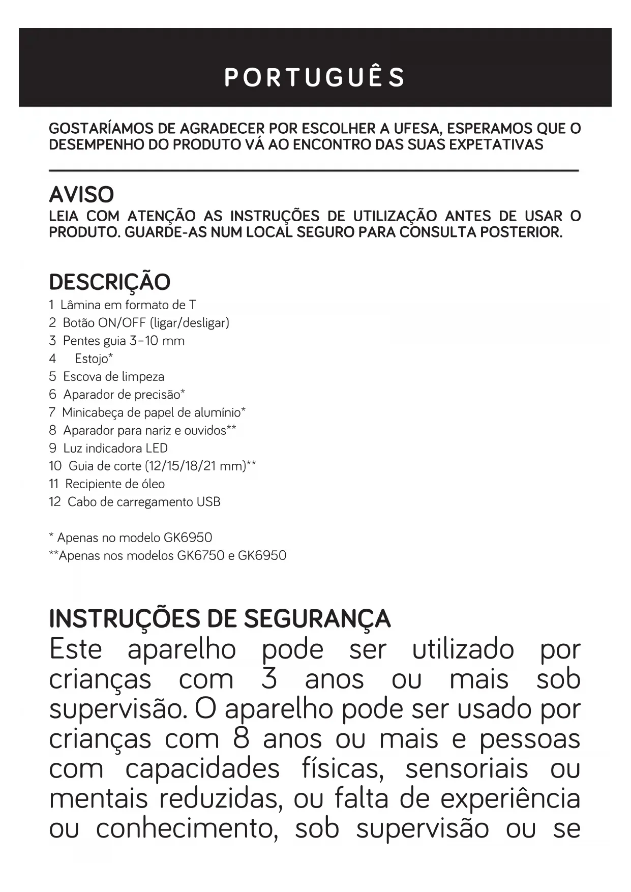 GOSTARÍAMOS DE AGRADECER POR ESCOLHER A UFESA, ESPERAMOS QUE O DESEMPENHO DO PRODUTO VÁ AO ENCONTRO DAS SUAS EXPETATIVAS AVISO LEIA COM ATENÇÃO AS INSTRUÇÕES DE UTILIZAÇÃO ANTES DE USAR O PRODUTO. GUARDE-AS NUM LOCAL SEGURO PARA CONSULTA POSTERIOR. DESCRIÇÃO 1 Lâmina em formato de T2 Botão ON/OFF (ligar/desligar)3 Pentes guia 3–10mm4 Estojo*5 Escova de limpeza6 Aparador de precisão*7 Minicabeça de papel de alumínio*8 Aparador para nariz e ouvidos**9 Luz indicadora LED10 Guia de corte (12/15/18/21mm)**11 Recipiente de óleo12 Cabo de carregamento USB* Apenas no modelo GK6950**Apenas nos modelos GK6750 e GK6950