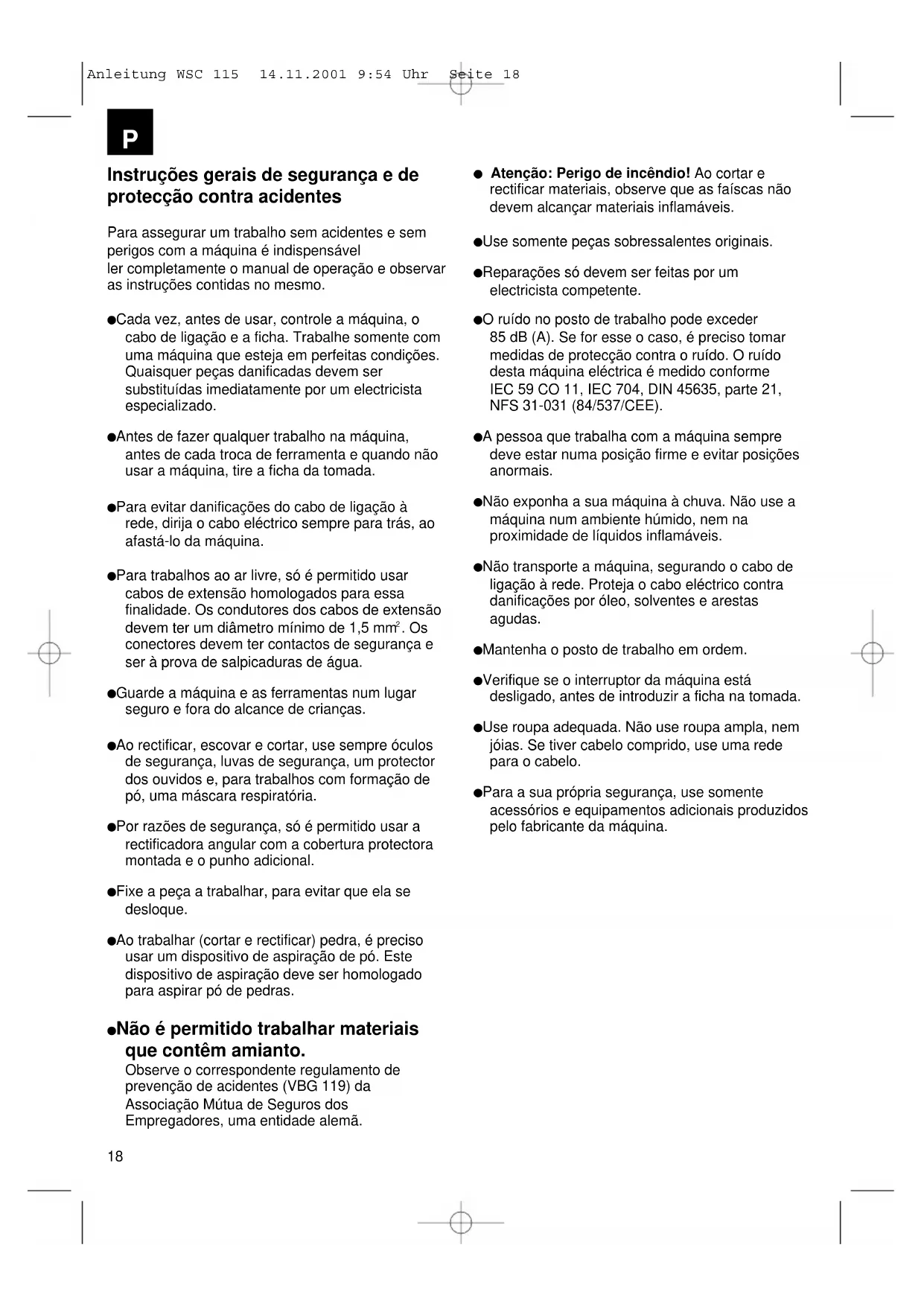 Brida de tensado Tuerca bridada Disposición de las bridas si se emplea un disco de corte recto. Anleitung WSC 115 14.11.2001 9:54 Uhr Seite 1718 Instruções gerais de segurança e de protecção contra acidentes Para assegurar um trabalho sem acidentes e sem perigos com a máquina é indispensável ler completamente o manual de operação e observar as instruções contidas no mesmo. Cada vez, antes de usar, controle a máquina, o cabo de ligação e a ficha. Trabalhe somente com uma máquina que esteja em perfeitas condições. Quaisquer peças danificadas devem ser substituídas imediatamente por um electricista especializado. Antes de fazer qualquer trabalho na máquina, antes de cada troca de ferramenta e quando não usar a máquina, tire a ficha da tomada. Para evitar danificações do cabo de ligação à rede, dirija o cabo eléctrico sempre para trás, ao afastá-lo da máquina. Para trabalhos ao ar livre, só é permitido usar cabos de extensão homologados para essa finalidade. Os condutores dos cabos de extensão devem ter um diâmetro mínimo de 1,5 mm