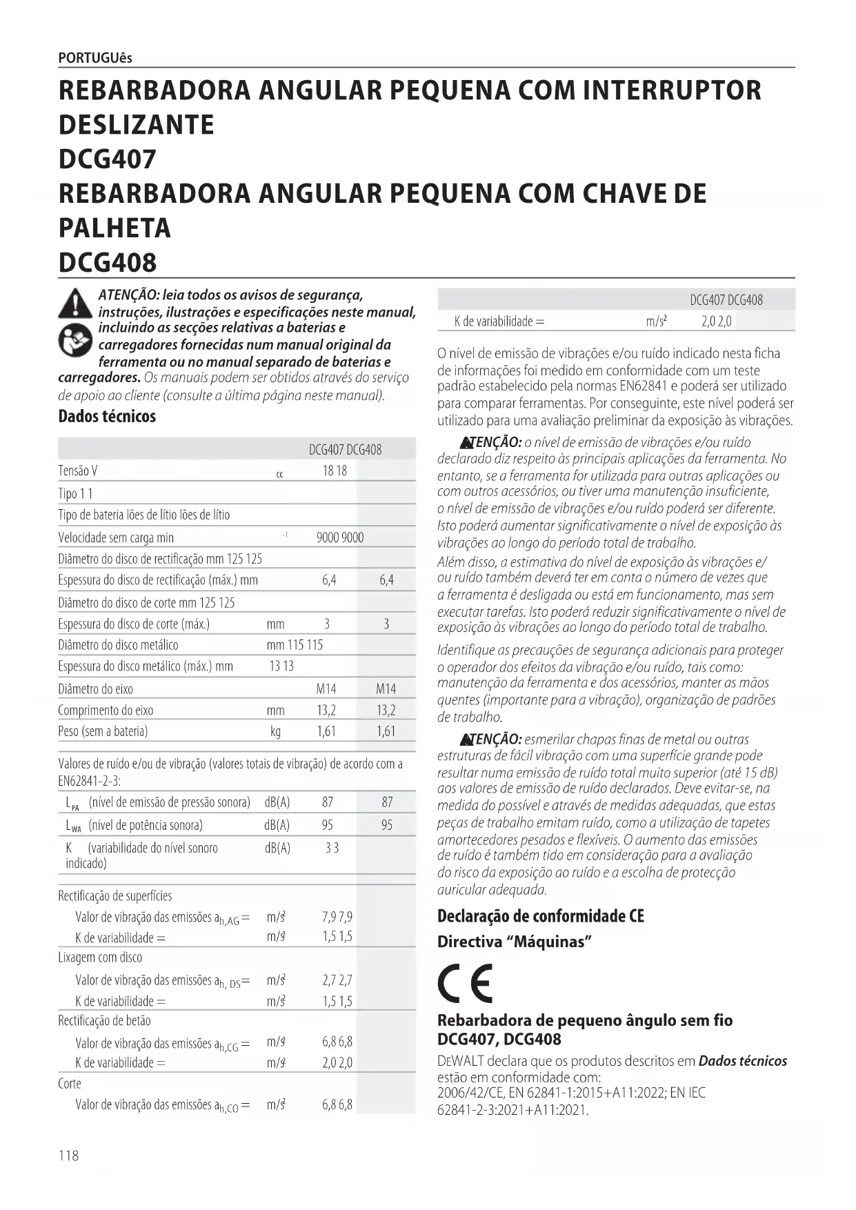 Rebarbadora de pequeno ângulo sem fio DCG407, DCG408 DeWALT declara que os produtos descritos em Dados técnicos estão em conformidade com: 2006/42/CE, EN 62841‑1:2015+A11:2022; EN IEC 62841‑2‑3:2021+A11:2021.O nível de emissão de vibrações e/ou ruído indicado nesta ficha de informações foi medido em conformidade com um teste padrão estabelecido pela normas EN62841 e poderá ser utilizado para comparar ferramentas. Por conseguinte, este nível poderá ser utilizado para uma avaliação preliminar da exposição àsvibrações. ATENÇÃO: o nível de emissão de vibrações e/ou ruído declarado diz respeito às principais aplicações da ferramenta. No entanto, se a ferramenta for utilizada para outras aplicações ou com outros acessórios, ou tiver uma manutenção insuficiente, o nível de emissão de vibrações e/ou ruído poderá ser diferente. Isto poderá aumentar significativamente o nível de exposição às vibrações ao longo do período total detrabalho.Além disso, a estimativa do nível de exposição às vibrações e/ou ruído também deverá ter em conta o número de vezes que a ferramenta é desligada ou está em funcionamento, mas sem executar tarefas. Isto poderá reduzir significativamente o nível de exposição às vibrações ao longo do período total detrabalho.Identifique as precauções de segurança adicionais para proteger o operador dos efeitos da vibração e/ou ruído, tais como: manutenção da ferramenta e dos acessórios, manter as mãos quentes (importante para a vibração), organização de padrões detrabalho. ATENÇÃO: esmerilar chapas finas de metal ou outras estruturas de fácil vibração com uma superfície grande pode resultar numa emissão de ruído total muito superior (até 15dB) aos valores de emissão de ruído declarados. Deve evitar-se, na medida do possível e através de medidas adequadas, que estas peças de trabalho emitam ruído, como a utilização de tapetes amortecedores pesados e flexíveis. O aumento das emissões de ruído é também tido em consideração para a avaliação do risco da exposição ao ruído e a escolha de protecção auricularadequada.DCG407 DCG408K de variabilidade = m/s