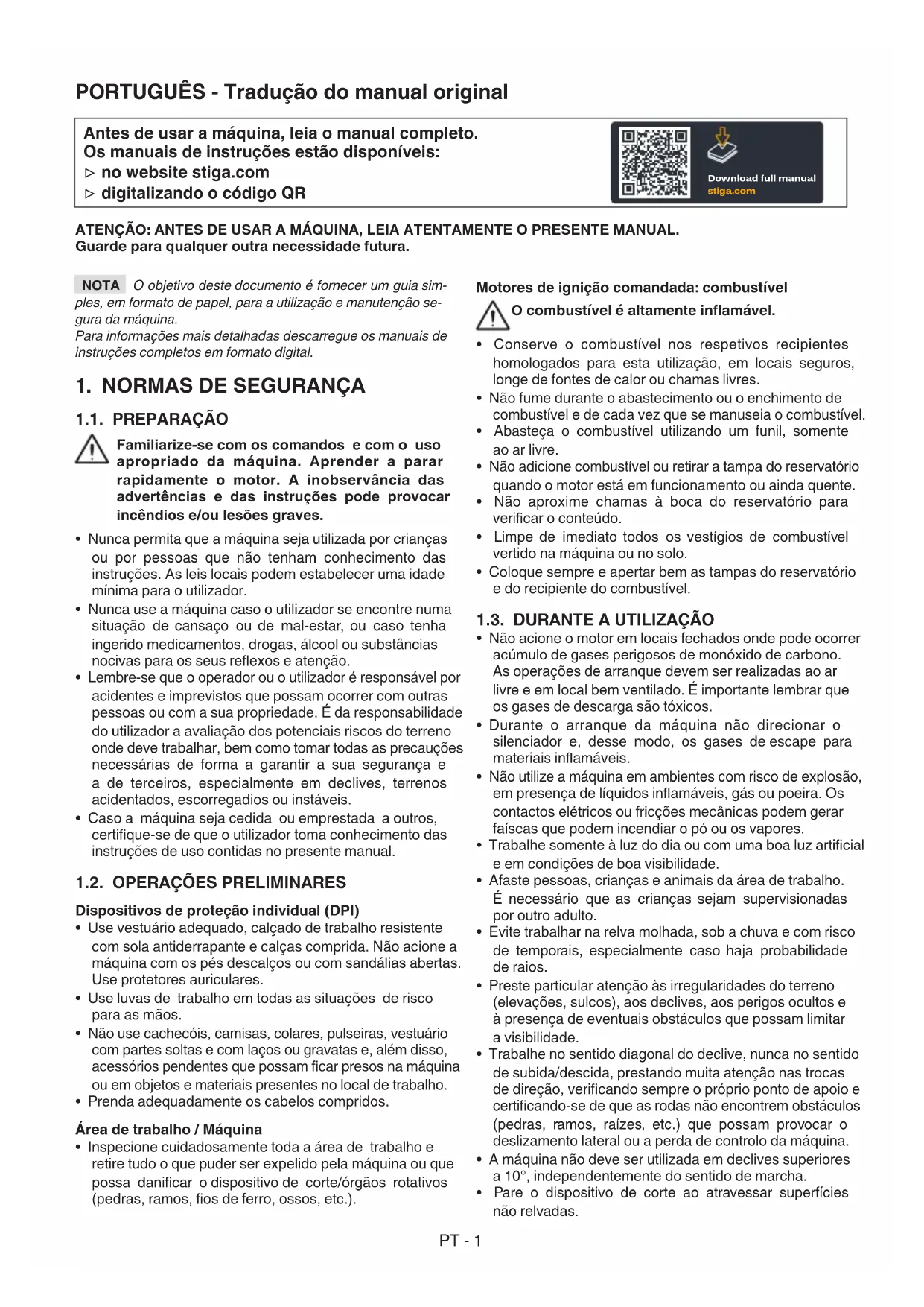 1.1. PREPARAÇÃO Familiarize-se com os comandos e com o uso apropriado da máquina. Aprender a parar rapidamente o motor. A inobservância das advertências e das instruções pode provocar incêndios e/ou lesões graves.