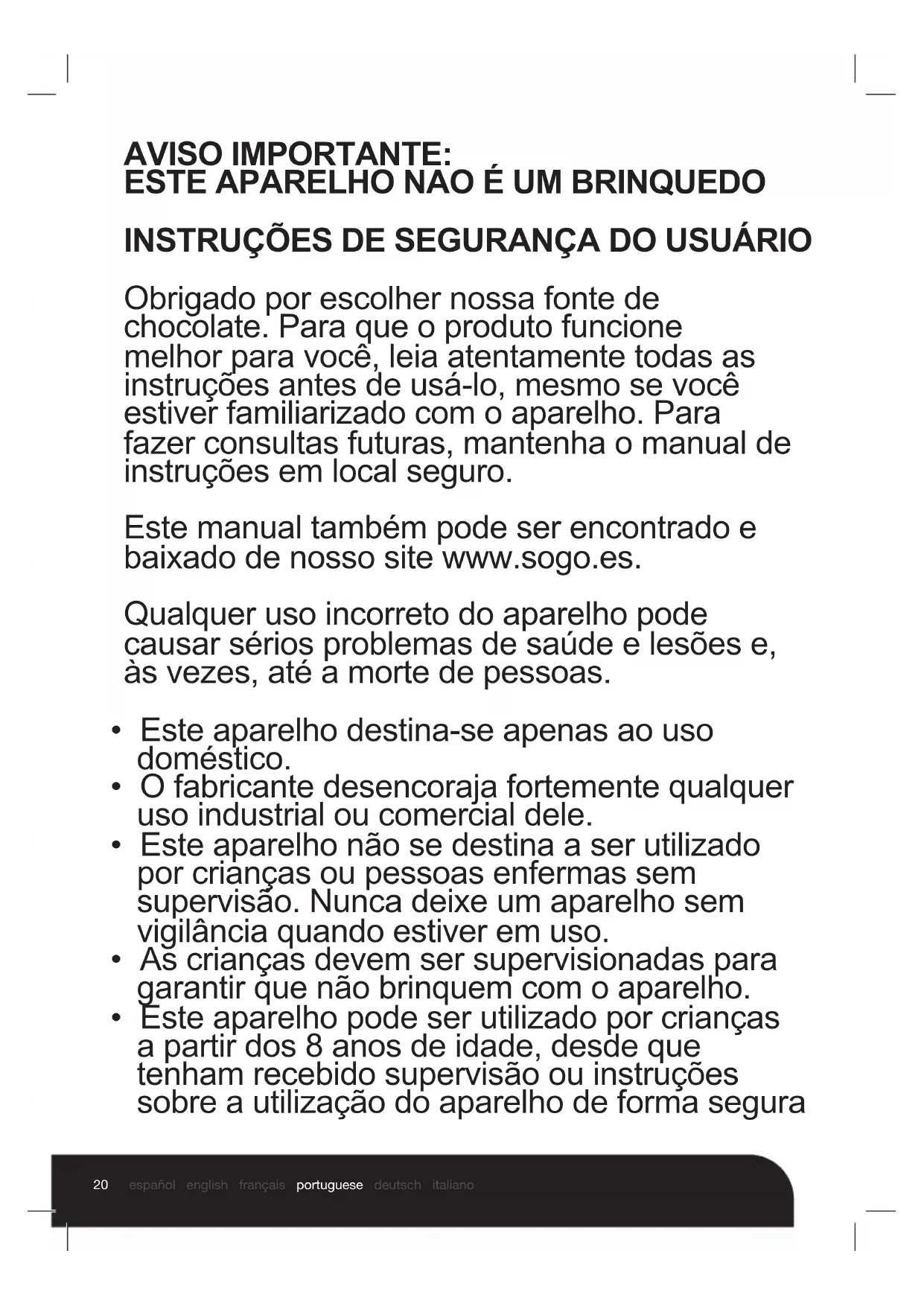 INSTRUÇÕES DE SEGURANÇA DO USUÁRIO Obrigado por escolher nossa fonte de chocolate. Para que o produto funcione melhor para você, leia atentamente todas as instruções antes de usá-lo, mesmo se você estiver familiarizado com o aparelho. Para fazer consultas futuras, mantenha o manual de instruções em local seguro. Este manual também pode ser encontrado e baixado de nosso site www.sogo.es. Qualquer uso incorreto do aparelho pode causar sérios problemas de saúde e lesões e, às vezes, até a morte de pessoas.