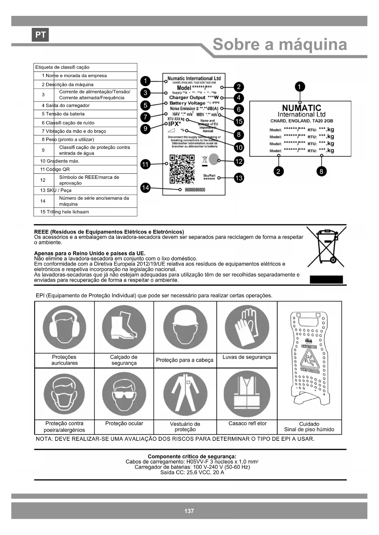 Carregador de baterias: 100 V-240 V (50-60 Hz) Saída CC: 25,6 VCC, 20 A Proteções auriculares Calçado de segurança Proteção para a cabeça Luvas de segurança Proteção contra poeira/alergénios Proteção ocular Vestuário de proteção Casaco re etor Cuidado Sinal de piso húmido EPI (Equipamento de Proteção Individual) que pode ser necessário para realizar certas operações. NOTA: DEVE REALIZAR-SE UMA AVALIAÇÃO DOS RISCOS PARA DETERMINAR O TIPO DE EPI A USAR. Etiqueta de classi cação1 Nome e morada da empresa2 Descrição da máquina Corrente de alimentação/Tensão/Corrente alternada/Frequência4 Saída do carregador5 Tensão da bateria6 Classi cação de ruído7 Vibração da mão e do braço8 Peso (pronto a utilizar) Classi cação de proteção contra entrada de água10 Gradiente máx.11 Código QR Símbolo de REEE/marca de aprovação13 SKU / Peça Número de série ano/semana da máquina15 Trilling hele lichaam