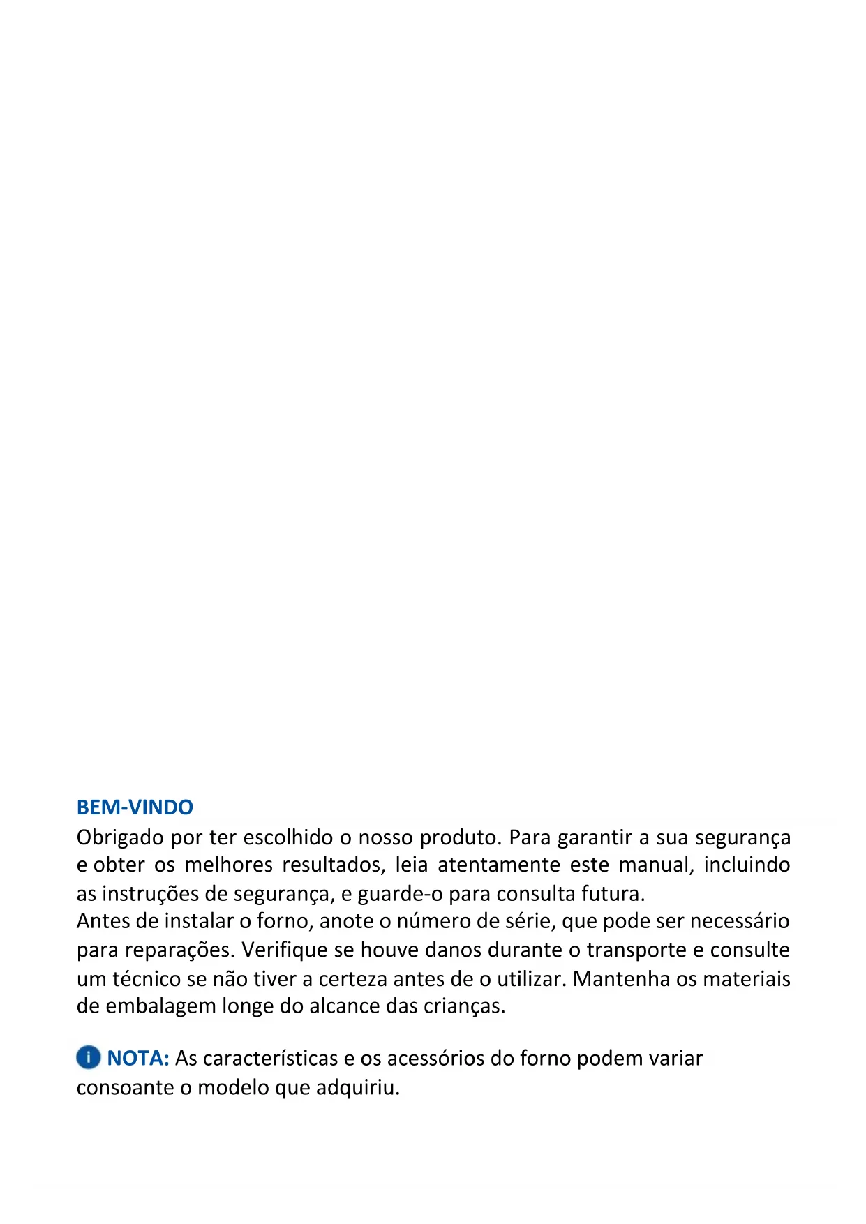 Afdekplaatje Afdekplaatje mmBEM-VINDO Obrigado por ter escolhido o nosso produto. Para garantir a sua segurança e obter os melhores resultados, leia atentamente este manual, incluindo as instruções de segurança, e guarde-o para consulta futura. Antes de instalar o forno, anote o número de série, que pode ser necessário para reparações. Verifique se houve danos durante o transporte e consulte um técnico se não tiver a certeza antes de o utilizar. Mantenha os materiais de embalagem longe do alcance das crianças. NOTA: As características e os acessórios do forno podem variar consoante o modelo que adquiriu.RESUMO