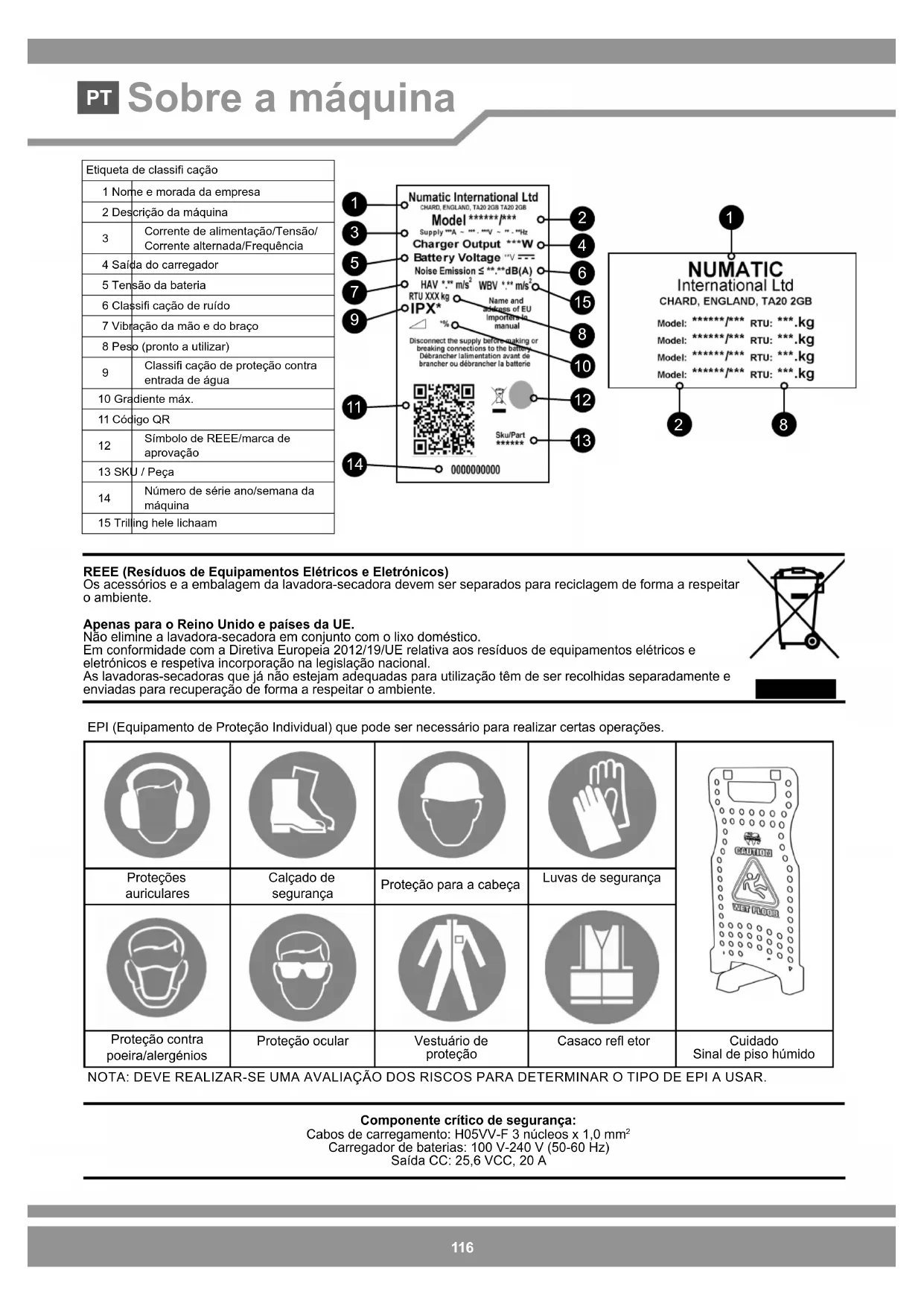 Carregador de baterias: 100 V-240 V (50-60 Hz) Saída CC: 25,6 VCC, 20 A Proteções auriculares Calçado de segurança Proteção para a cabeça Luvas de segurança Proteção contra poeira/alergénios Proteção ocular Vestuário de proteção Casaco re etor Cuidado Sinal de piso húmido EPI (Equipamento de Proteção Individual) que pode ser necessário para realizar certas operações. NOTA: DEVE REALIZAR-SE UMA AVALIAÇÃO DOS RISCOS PARA DETERMINAR O TIPO DE EPI A USAR. Etiqueta de classi cação1 Nome e morada da empresa2 Descrição da máquina Corrente de alimentação/Tensão/Corrente alternada/Frequência4 Saída do carregador5 Tensão da bateria6 Classi cação de ruído7 Vibração da mão e do braço8 Peso (pronto a utilizar) Classi cação de proteção contra entrada de água10 Gradiente máx.11 Código QR Símbolo de REEE/marca de aprovação13 SKU / Peça Número de série ano/semana da máquina15 Trilling hele lichaam
