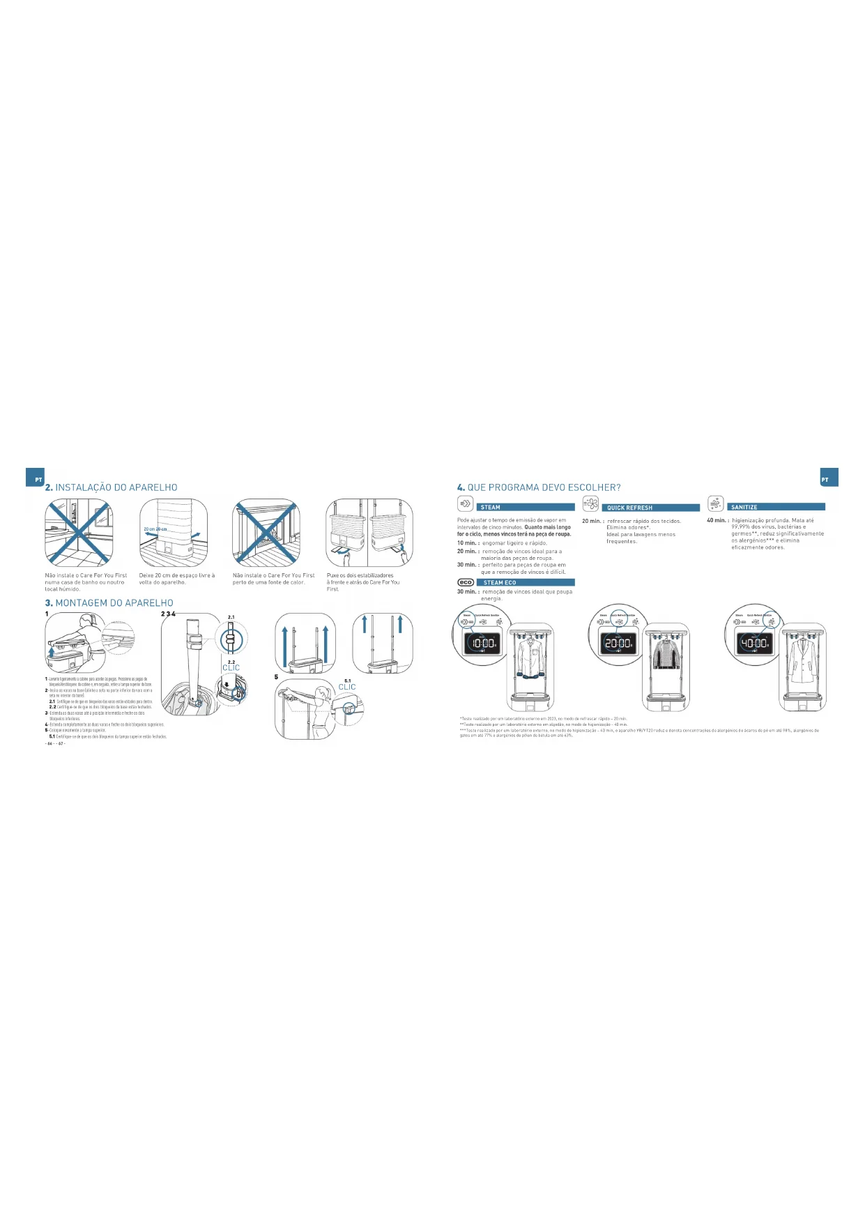 YR2020_1820012320_IFU_Care4U_First_Rowenta.indd 64-65YR2020_1820012320_IFU_Care4U_First_Rowenta.indd 64-65 13/12/2023 17:52:4313/12/2023 17:52:4320 cm 20 cm SteamQuick Refresh Sanitize SteamQuick Refresh Sanitize SteamQuick Refresh Sanitize - 66 - - 67 - PTPT Não instale o Care For You First numa casa de banho ou noutro local húmido. Deixe 20 cm de espaço livre à volta do aparelho. Não instale o Care For You First perto de uma fonte de calor. Puxe os dois estabilizadores à frente e atrás do Care For You First.