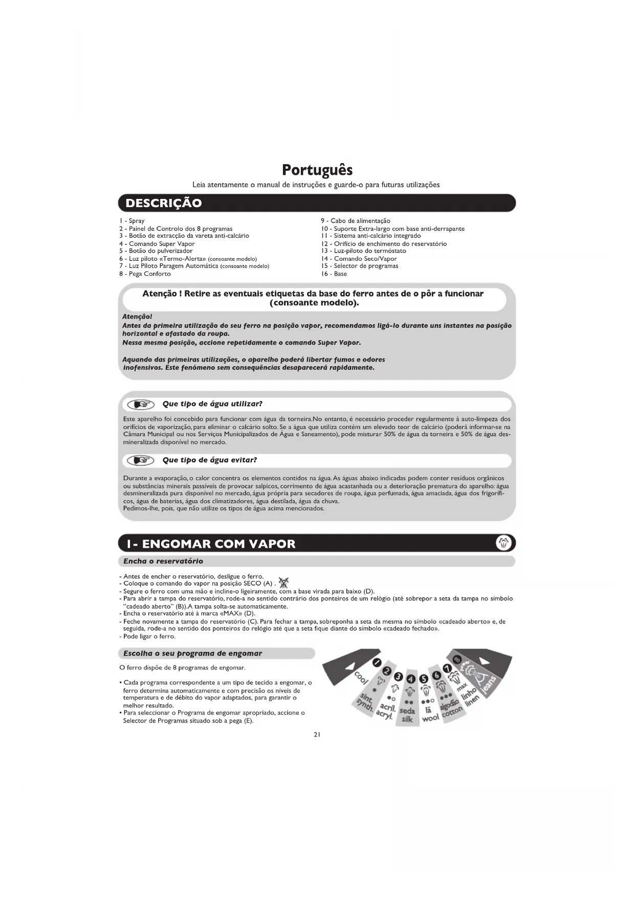 consoante modelo). Português Leia atentamente o manual de instruções e guarde-o para futuras utilizações DESCRIÇÃO 1 - Spray2 - Painel de Controlo dos 8 programas3 - Botão de extracção da vareta anti-calcário4 - Comando Super Vapor5 - Botão do pulverizador6 - Luz piloto «Termo-Alerta» (consoante modelo)7 - Luz Piloto Paragem Automática (consoante modelo)8 - Pega Conforto9 - Cabo de alimentação10 - Suporte Extra-largo com base anti-derrapante11 - Sistema anti-calcário integrado 12 - Orifício de enchimento do reservatório13 - Luz-piloto do termóstato14 - Comando Seco/Vapor15 - Selector de programas16 - Base22