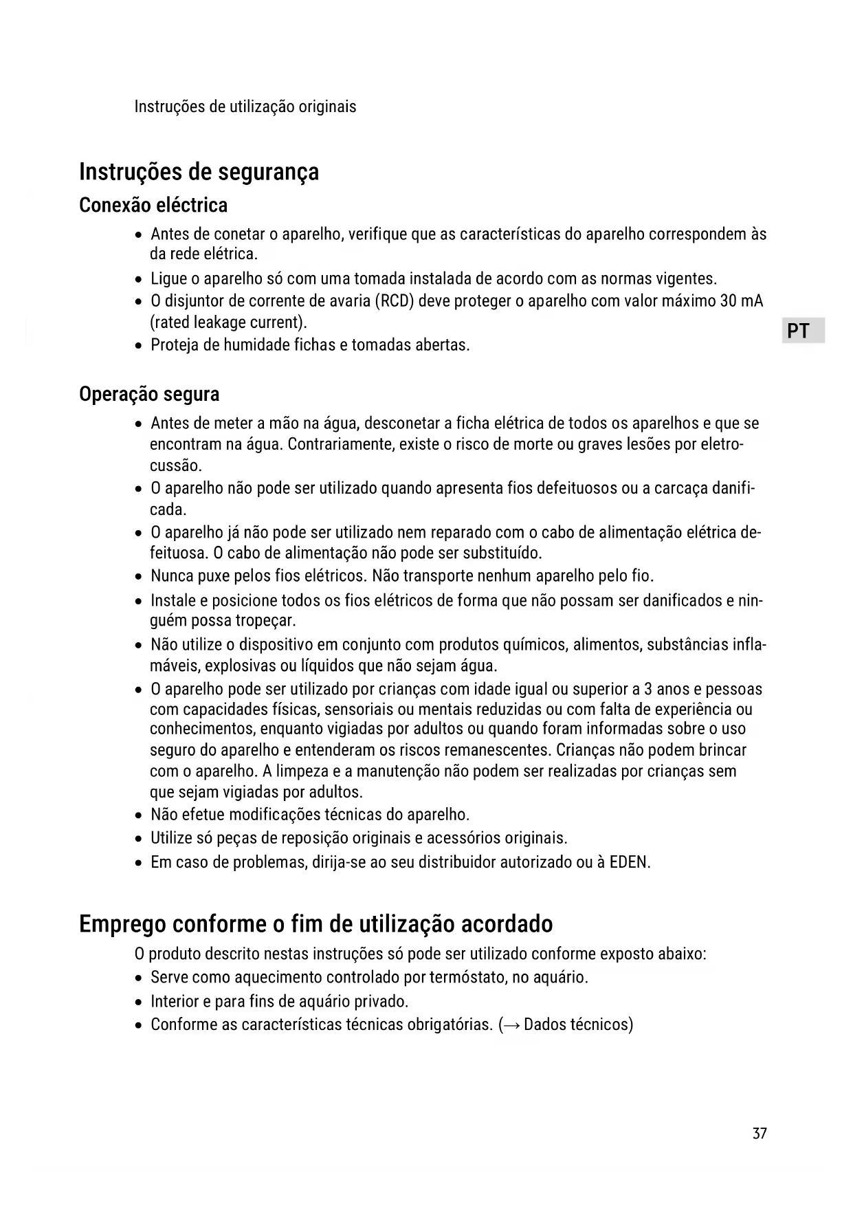 - Em caso de problemas, dirija-se ao seu distribuidor autorizado ou à EDEN. Emprego conforme o fim de utilização acordado O produto descrito nestas instruções só pode ser utilizado conforme exposto abaixo: