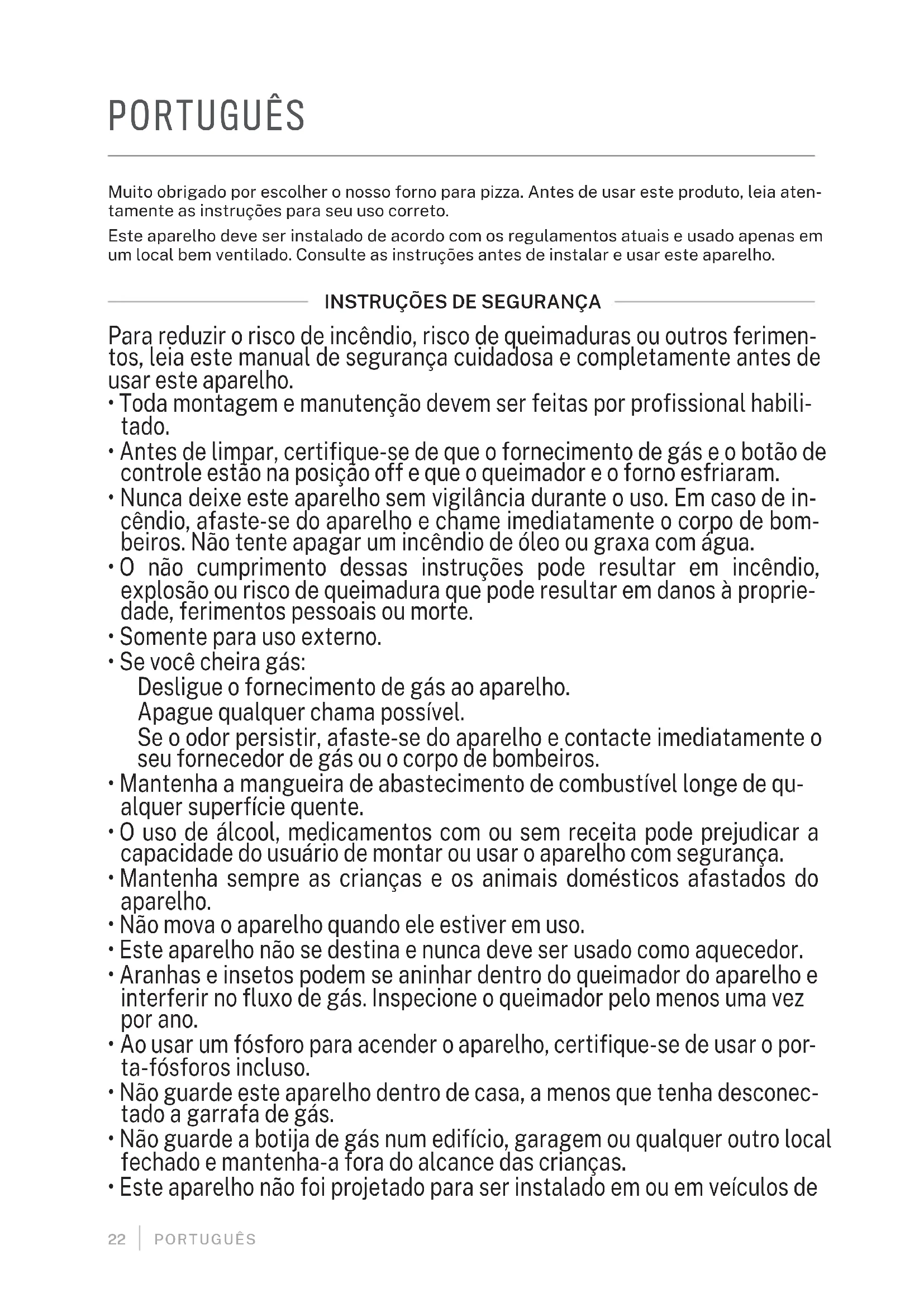 - A base do forno atinge temperaturas extremamente altas. Não coloque o forno sobre uma mesa com toalhas de mesa, plásticos ou qualquer outro material inamável inamável.25 PORTUGUÊS MONTAGEM 1 Desdobre as pernas. Toda a montagem e manutenção deve ser realizada por um prossional qualicado, contacte o serviço pós-venda. Antes de montar o forno, certique-se de que todas as peças estão presentes. Se alguma peça estiver faltando ou danicada, não tente montar o aparelho. Entre em contato com o atendimento ao cliente para peças de reposição. 2 Entre na mesa de tiro de pedra. 3 Conecte a mangueira de gás ao forno de pizza. Conecte a mangueira de gás ao tubo de entrada e prenda-a com uma braçadeira de metal. Insira a pedra com uma ligeira inclinação para cima, de baixo para cima, até que caiba dentro do forno. Empurrando com o dedo, por este orifício vai levantar a pe- dra para poder retirá-la mais facilmente.26 PORTUGUÊS CONECTE O CILINDRO DE GÁS LP Para conectar o cilindro de gás: 1 A válvula do cilindro deve estar na posição DESLIGADA. 2 Certique-se de que o botão de controle do forno está na posição OFF. 3 Inspecione as conexões da válvula, porta e conjunto do regulador. Remova a sujeira e in- specione a mangueira quanto a danos. 4 Ao conectar o conjunto do regulador à válvula do cilindro, use a mão para apertar a porca no sentido horário até que ela pare. O uso de uma chave inglesa pode danicar a porca de acoplamento rápido e causar uma situação perigosa. 5 Abra totalmente a válvula do cilindro girando o regulador no sentido anti-horário. 6 Antes de ligar o forno, use uma solução de água e sabão para vericar se há vazamentos nas conexões. 7 Se for encontrado um vazamento, feche a válvula do cilindro e não use o forno até que seu fornecedor local possa fazer os reparos. DESCONECTE O CILINDRO DE GÁS LP 1 Desligue o forno e verique se ele está frio. 2 Feche a válvula do cilindro girando o regulador no sentido horário até que ele pare. 3 Retire o regulador da válvula do cilindro girando a porca de acoplamento rápido no sentido anti-horário. 4 Coloque uma tampa de proteção contra poeira na saída da válvula do cilindro sempre que não estiver usando. AVISO Mantenha sempre o cilindro na posição vertical. O tamanho do cilindro de 9L é 31 cm de diâmetro e 45,5 cm de altura. Se você não estiver usando o aparelho, você deve desligar o gás da garrafa. O cilindro usado deve incluir um colar para proteger a válvula. A distância mínima entre o forno e o cilindro de 9L é de 1m.