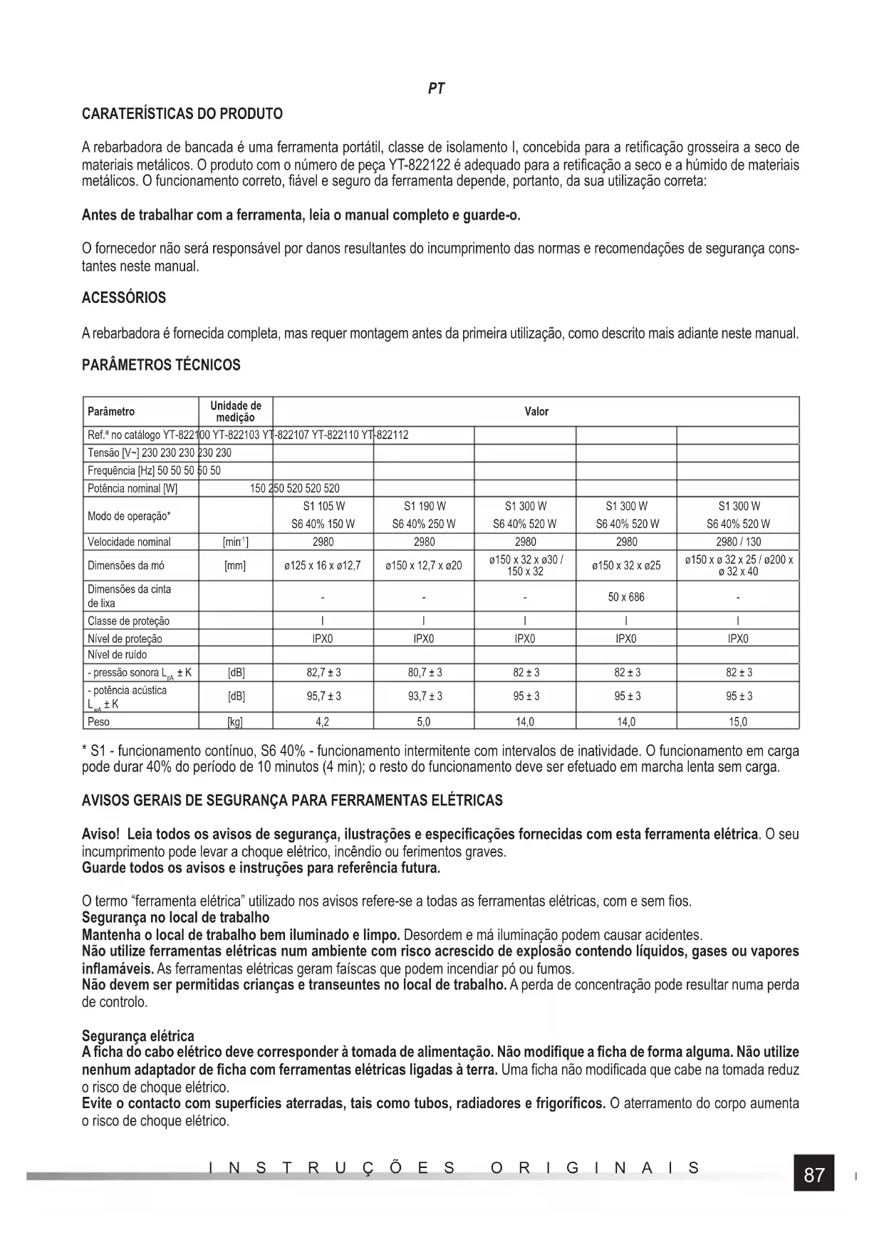 A rebarbadora de bancada é uma ferramenta portátil, classe de isolamento I, concebida para a retifi cação grosseira a seco de materiais metálicos. O produto com o número de peça YT-822122 é adequado para a retifi cação a seco e a húmido de materiais metálicos. O funcionamento correto, fi ável e seguro da ferramenta depende, portanto, da sua utilização correta: Antes de trabalhar com a ferramenta, leia o manual completo e guarde-o. O fornecedor não será responsável por danos resultantes do incumprimento das normas e recomendações de segurança cons- tantes neste manual. ACESSÓRIOS A rebarbadora é fornecida completa, mas requer montagem antes da primeira utilização, como descrito mais adiante neste manual.