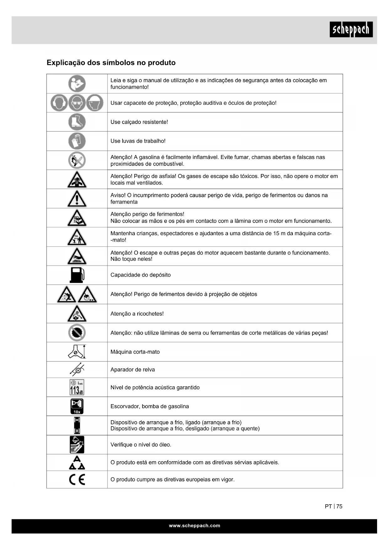 Explicação dos símbolos no produto Leia e siga o manual de utilização e as indicações de segurança antes da colocação em funcionamento! Usar capacete de proteção, proteção auditiva e óculos de proteção! Use calçado resistente! Use luvas de trabalho! Atenção! A gasolina é facilmente inamável. Evite fumar, chamas abertas e faíscas nas proximidades de combustível. Atenção! Perigo de asxia! Os gases de escape são tóxicos. Por isso, não opere o motor em locais mal ventilados. Aviso! O incumprimento poderá causar perigo de vida, perigo de ferimentos ou danos na ferramenta Atenção perigo de ferimentos! Não colocar as mãos e os pés em contacto com a lâmina com o motor em funcionamento. 15m Mantenha crianças, espectadores e ajudantes a uma distância de 15 m da máquina corta- -mato! Atenção! O escape e outras peças do motor aquecem bastante durante o funcionamento. Não toque neles! Capacidade do depósito Atenção! Perigo de ferimentos devido à projeção de objetos Atenção a ricochetes! Atenção: não utilize lâminas de serra ou ferramentas de corte metálicas de várias peças! Máquina corta-mato Aparador de relva Nível de potência acústica garantido Escorvador, bomba de gasolina Dispositivo de arranque a frio, ligado (arranque a frio) Dispositivo de arranque a frio, desligado (arranque a quente) Verique o nível do óleo. O produto está em conformidade com as diretivas sérvias aplicáveis. O produto cumpre as diretivas europeias em vigor.www.scheppach.com