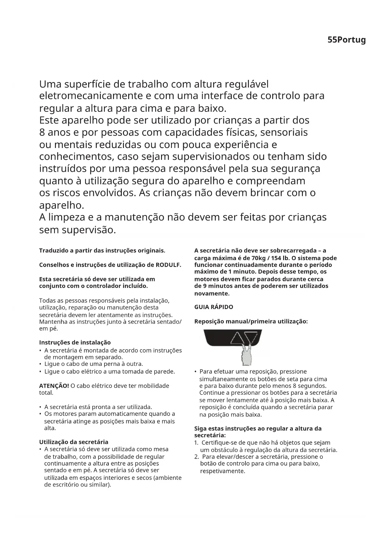- A secretária só deve ser utilizada como mesa de trabalho, com a possibilidade de regular continuamente a altura entre as posições sentado e em pé. A secretária só deve ser utilizada em espaços interiores e secos (ambiente de escritório ou similar). Asecretárianãodevesersobrecarregada–a cargamáximaéde70kg/154lb.Osistemapode funcionarcontinuadamenteduranteoperíodo máximode1minuto.Depoisdessetempo,os motoresdevemcarparadosdurantecerca de9minutosantesdepoderemserutilizados novamente.