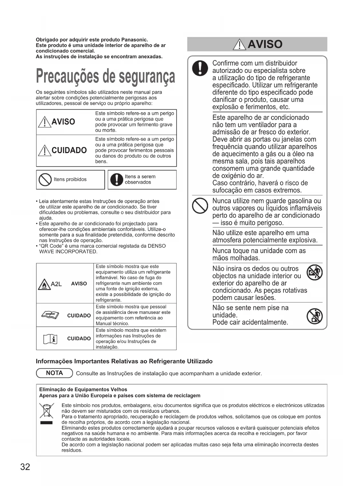 Als de stroom uitvalt terwijl de unit in bedrijf is Het toestel zal automatisch doorgaan met de ingestelde handeling. Dezelfde bedieningsinstellingen van voor de stroomstoring zullen worden gebruikt. KENNISGEVING Deze airconditioner bevat een product met biocide-werking.Vrije radicalen gegenereerd door een component in de airconditioner hebben het vermogen om de werking van schadelijke deeltjes in de lucht, zoals sommige soorten bacteriën, virussen en schimmels, te remmen.Actieve stoen: vrije radicalen die ter plekke gegenereerd worden uit lucht of water in de omgevingGebruik: Deze functie van het toestel kan AAN / UIT worden gezet met de knop met het pictogram voor “nanoe X” of door middel van afstandbediende instellingen als er geen knop met het pictogram voor “nanoe X” is. Gelieve “Gebruik” te raadplegen voor meer details. Scan de QR-code op de voorpagina om de gedetailleerde gebruiksinstructies te lezen. Werking 00_360661_all.indb 3100_360661_all.indb 31 2024/10/07 17:19:352024/10/07 17:19:3532 Obrigado por adquirir este produto Panasonic.Este produto é uma unidade interior de aparelho de ar condicionado comercial.As instruções de instalação se encontram anexadas. AVISO Precauções de segurança Os seguintes símbolos são utilizados neste manual para alertar sobre condições potencialmente perigosas aos utilizadores, pessoal de serviço ou próprio aparelho: AVISO Este símbolo refere-se a um perigo ou a uma prática perigosa que pode provocar um ferimento grave ou morte. CUIDADO Este símbolo refere-se a um perigo ou a uma prática perigosa que pode provocar ferimentos pessoais ou danos do produto ou de outros bens.Itens proibidosItens a serem observadosInformações Importantes Relativas ao Refrigerante Utilizado NOTA Consulte as Instruções de instalação que acompanham a unidade exterior.Eliminação de Equipamentos VelhosApenas para a União Europeia e países com sistema de reciclagemEste símbolo nos produtos, embalagens, e/ou documentos signica que os produtos eléctricos e electrónicos utilizadas não devem ser misturados com os resíduos urbanos.Para o tratamento apropriado, recuperação e reciclagem de produtos velhos, solicitamos que os coloque em pontos de recolha próprios, de acordo com a legislação nacional.Eliminando estes produtos correctamente ajudará a poupar recursos valiosos e evitará quaisquer potenciais efeitos negativos na saúde humana e no ambiente. Para mais informações acerca da recolha e reciclagem, por favor contacte as autoridades locais.De acordo com a legislação nacional podem ser aplicadas multas caso seja feita uma eliminação incorrecta destes resíduos.• Leia atentamente estas Instruções de operação antes de utilizar este aparelho de ar condicionado. Se tiver diculdades ou problemas, consulte o seu distribuidor para ajuda.• Este aparelho de ar condicionado foi projectado para oferecer-lhe condições ambientais confortáveis. Utilize-o somente para a sua nalidade pretendida, conforme descrito nas Instruções de operação.• “QR Code” é uma marca comercial registada da DENSO WAVE INCORPORATED.AVISOEste símbolo mostra que este equipamento utiliza um refrigerante inflamável. No caso de fuga do refrigerante num ambiente com uma fonte de ignição externa, existe a possibilidade de ignição do refrigerante.CUIDADOEste símbolo mostra que pessoal de assistência deve manusear este equipamento com referência ao Manual técnico.CUIDADOEste símbolo mostra que existem informações nas Instruções de operação e/ou Instruções de instalação. Conrme com um distribuidor autorizado ou especialista sobre a utilização do tipo de refrigerante especicado. Utilizar um refrigerante diferente do tipo especicado pode danicar o produto, causar uma explosão e ferimentos, etc. Este aparelho de ar condicionado não tem um ventilador para a admissão de ar fresco do exterior. Deve abrir as portas ou janelas com frequência quando utilizar aparelhos de aquecimento a gás ou a óleo na mesma sala, pois tais aparelhos consomem uma grande quantidade de oxigénio do ar. Caso contrário, haverá o risco de sufocação em casos extremos. Nunca utilize nem guarde gasolina ou outros vapores ou líquidos inamáveis perto do aparelho de ar condicionado — isso é muito perigoso. Não utilize este aparelho em uma atmosfera potencialmente explosiva. Nunca toque na unidade com as mãos molhadas. Não insira os dedos ou outros objectos na unidade interior ou exterior do aparelho de ar condicionado. As peças rotativas podem causar lesões. Não se sente nem pise na unidade. Pode cair acidentalmente. 00_360661_all.indb 3200_360661_all.indb 32 2024/10/07 17:19:352024/10/07 17:19:3533 PORTUGUÊS Se o refrigerante entrar em contacto com uma chama, ele produzirá gases tóxicos. Para a segurança, certique-se de que desliga o aparelho de ar condicionado e de que desliga a alimentação antes de qualquer limpeza ou serviço. Retire a cha de alimentação da tomada eléctrica, ou desligue o disjuntor de circuito, ou desligue o meio de desligamento de energia para isolar o aparelho de ar condicionado do fornecimento de energia principal em caso de emergência. Elimine o produto de acordo com a legislação nacional e/ou local. Este produto não deve ser modicado ou desmontado em nenhuma hipótese. Uma unidade desmontada ou modicada pode causar incêndio, choque eléctrico ou ferimento. O interior das unidades interiores e exteriores não deve ser limpo pelos utilizadores. Entre em contacto com um distribuidor autorizado ou técnico especializado para efectuar a limpeza. Em caso de avaria deste aparelho, não o repare por conta própria. Entre em contacto com o representante de vendas ou o representante de assistência para efectuar uma reparação ou eliminação. Providencie uma tomada eléctrica para ser utilizada exclusivamente para cada unidade, bem como um interruptor para a fonte de energia, um disjuntor de fuga à terra (ELC