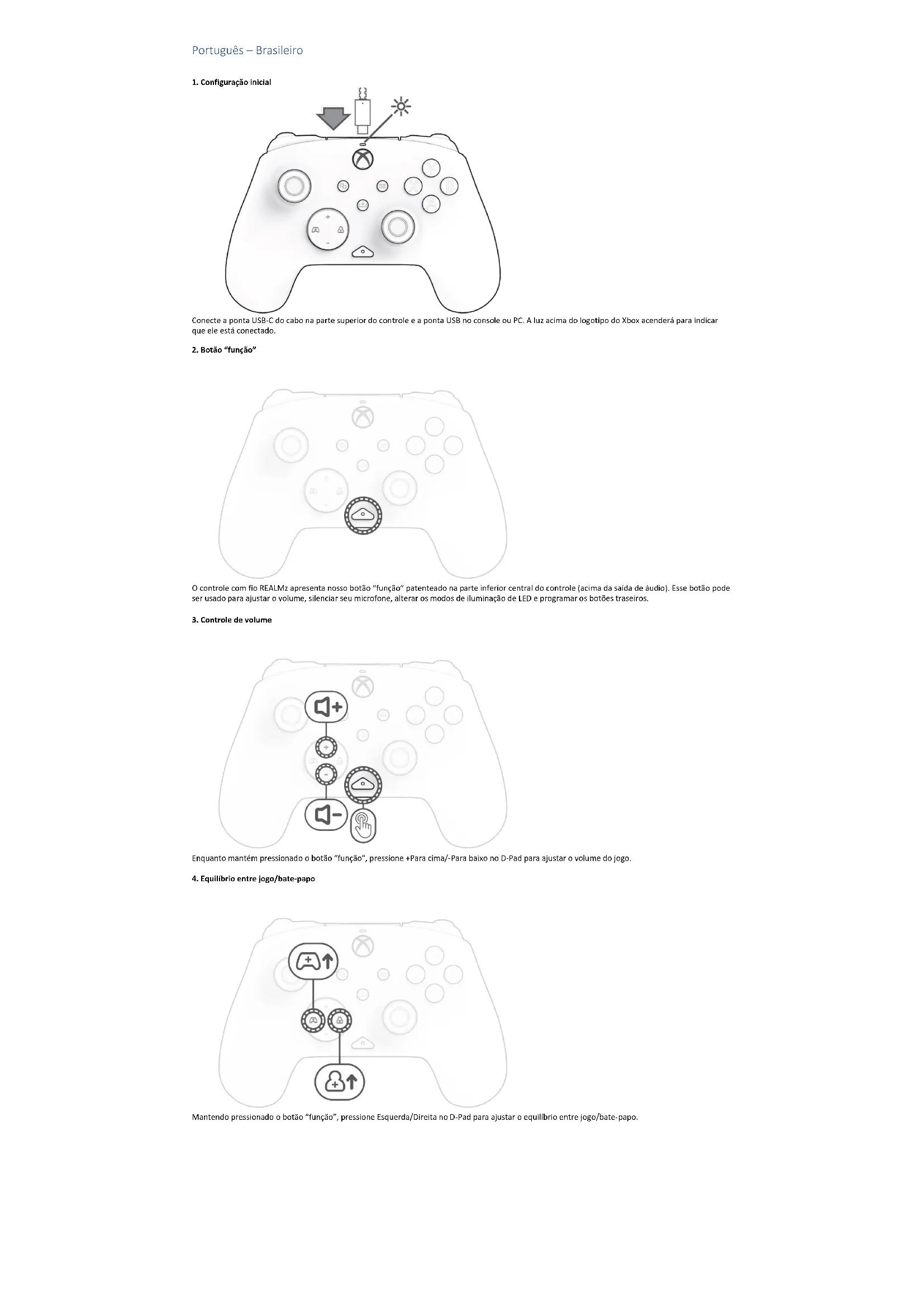 O controlador com fios REALMz tem o nosso botão patenteado de “função” na parte central inferior do controlador (acima da entrada de áudio). Este botão pode ser utilizado para ajustar o volume, silenciar o microfone, alterar os modos de iluminação LED e programar os botões traseiros.